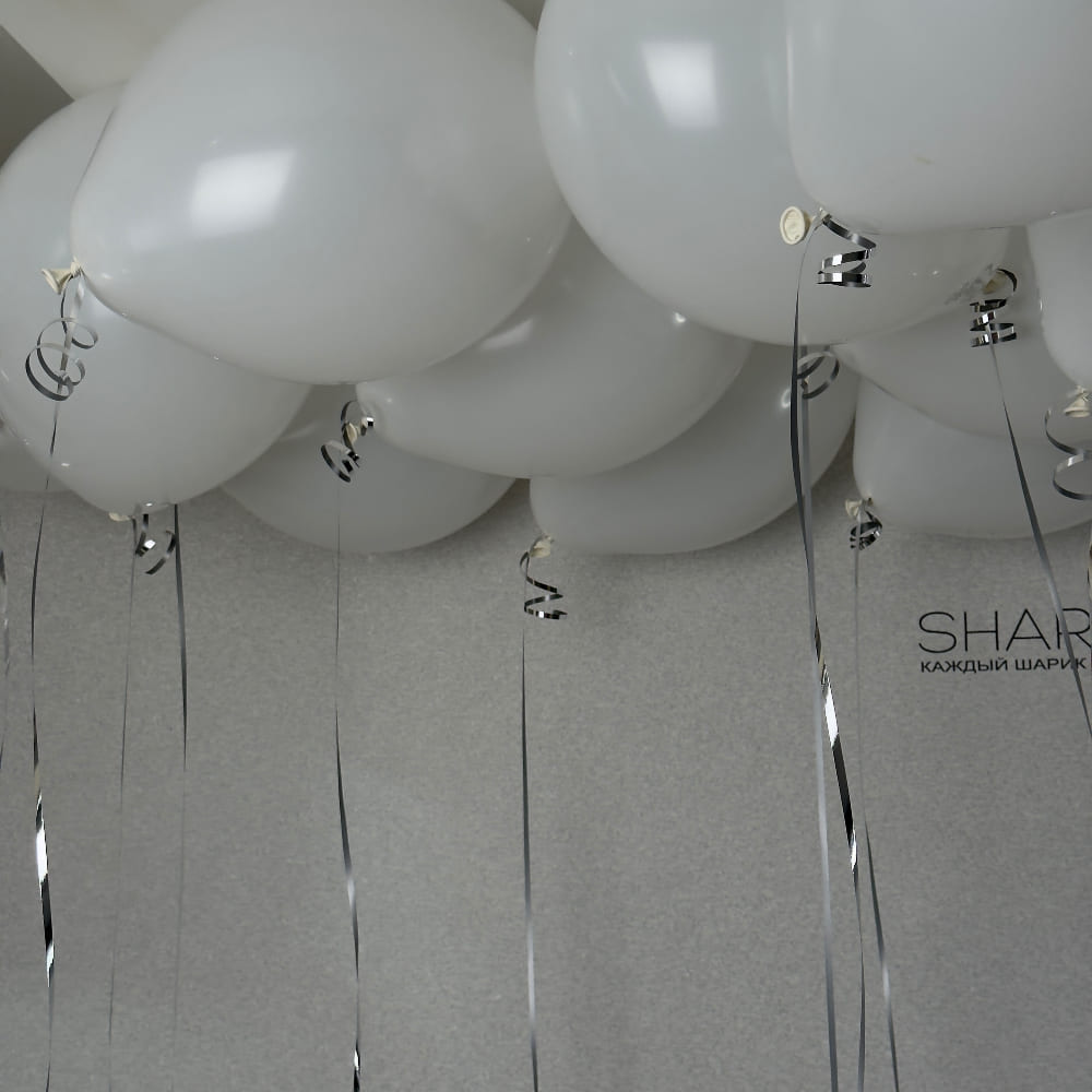 - Под потолок 15 белых шаров с серебряной лентой