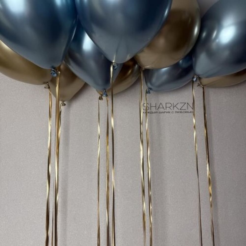 - 15 хромированных шаров под потолок с золотой лентой: 8 синих хром, 7 золото хром
