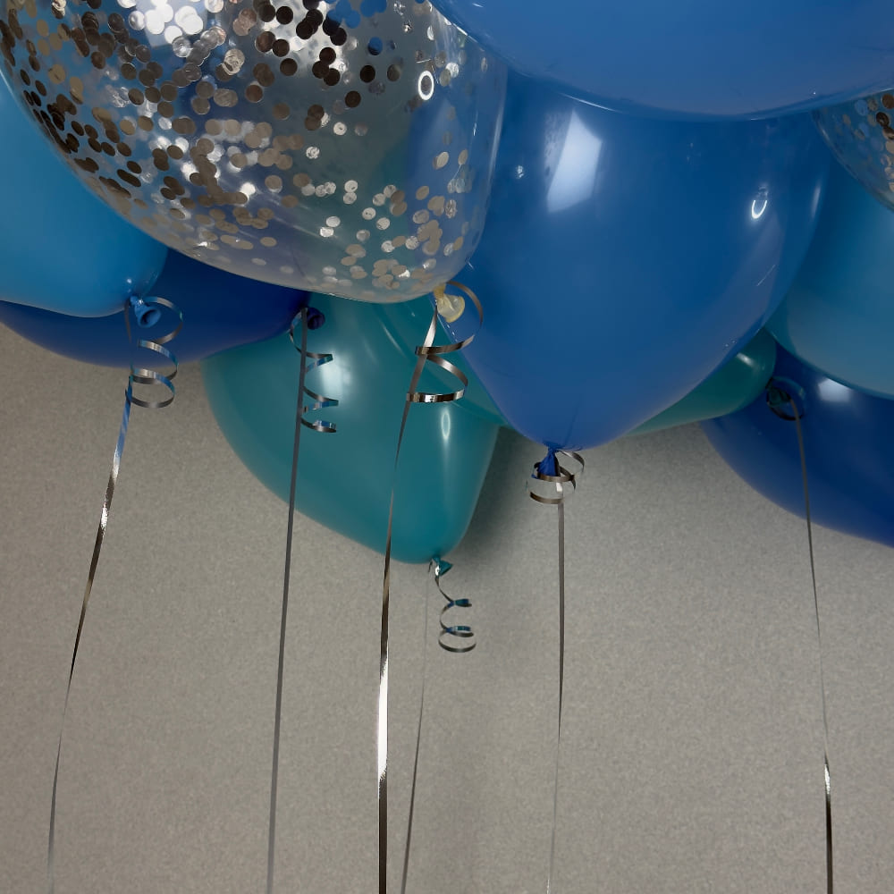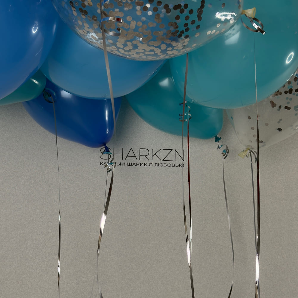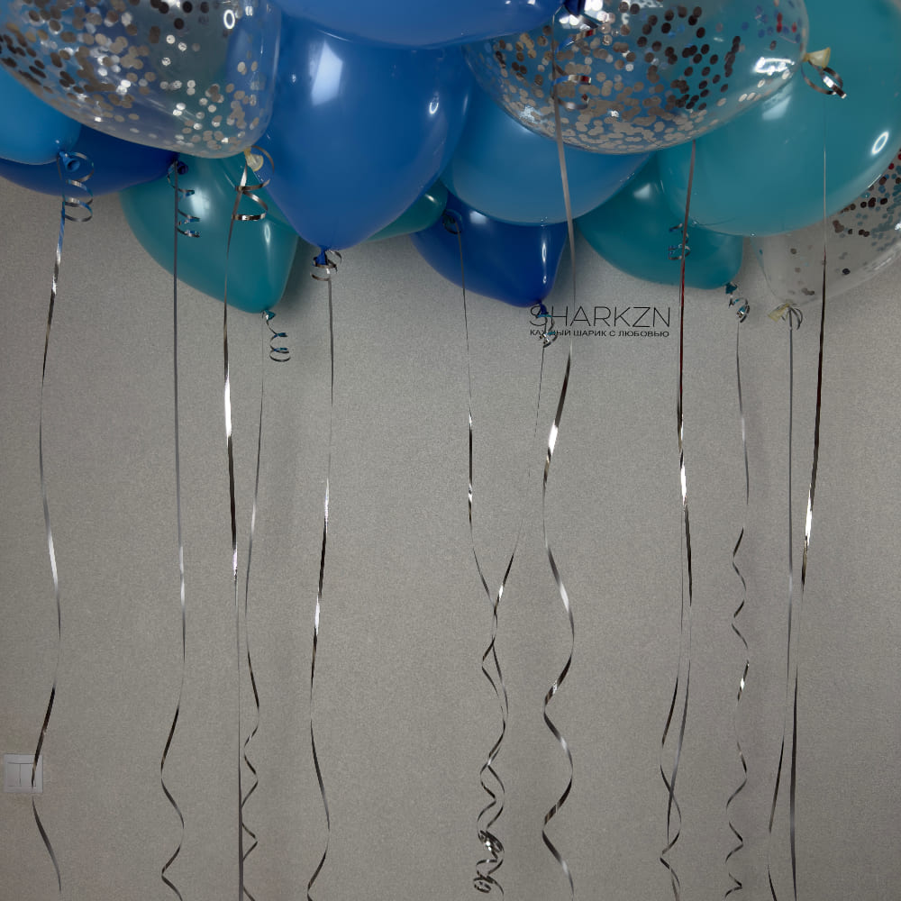 - 20 шаров под потолок с серебряной лентой: 5 голубых, 5 синих, 5 аквамарин, 5 прозрачных с конфетти серебро