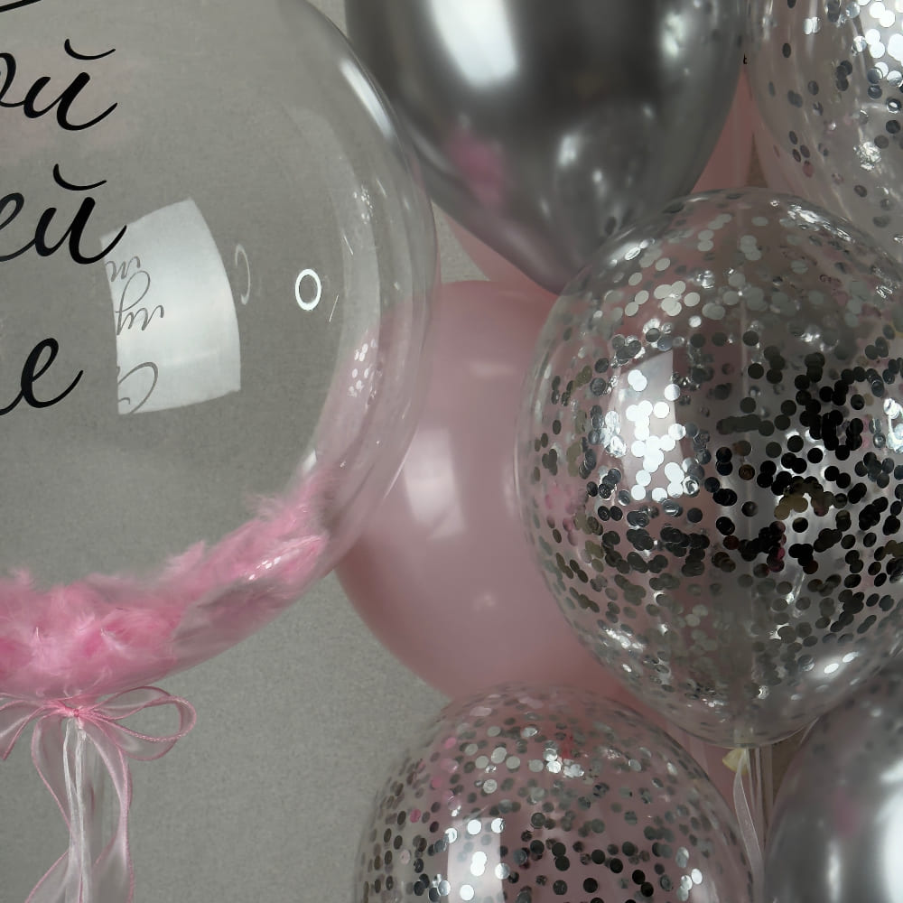 Большой прозрачный баблс, наполненный легкими перьями, с элегантной черной надписью, станет центром композиции. А вокруг него мы создаем пышный фонтан из 13 шаров! Здесь есть всё: классические матовые шары, сияющий хром и игривые прозрачные шары с конфетти. Такое разнообразие фактур говорит о вашей щедрости и желании подарить маме целый мир внимания.