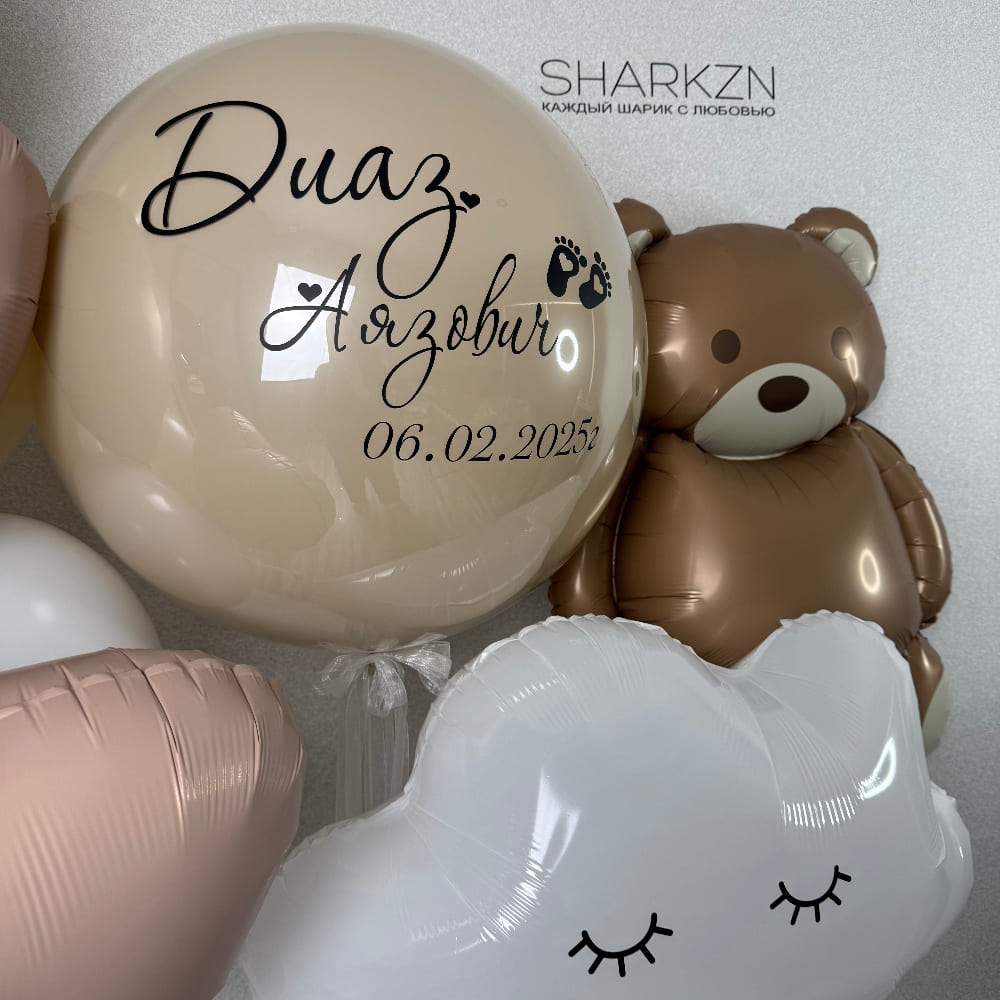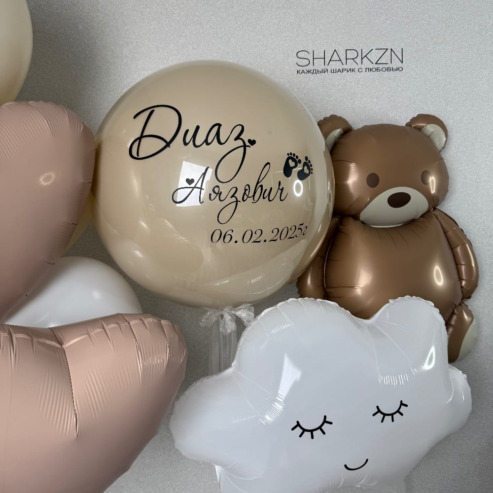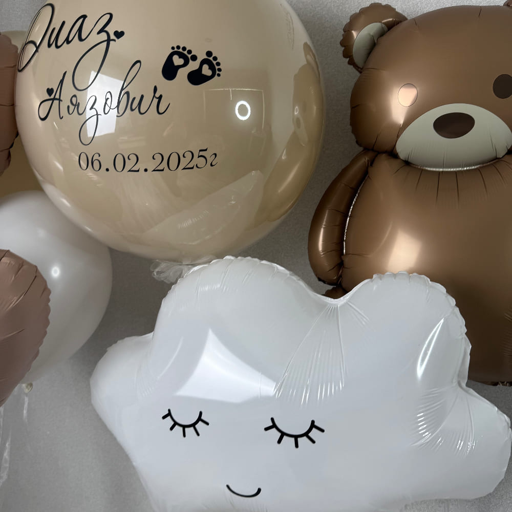 В центре композиции — большой кремовый стеклянный шар с элегантной черной надписью, на которой мы разместим имя, отчество и дату рождения малыша. Рядом с ним — добрый фольгированный Мишка и легкое Облачко, символы заботы и безмятежности. Нежный фонтан из шаров в кремовых тонах дополняет картину, создавая атмосферу уюта и гармонии.