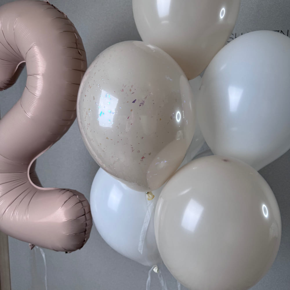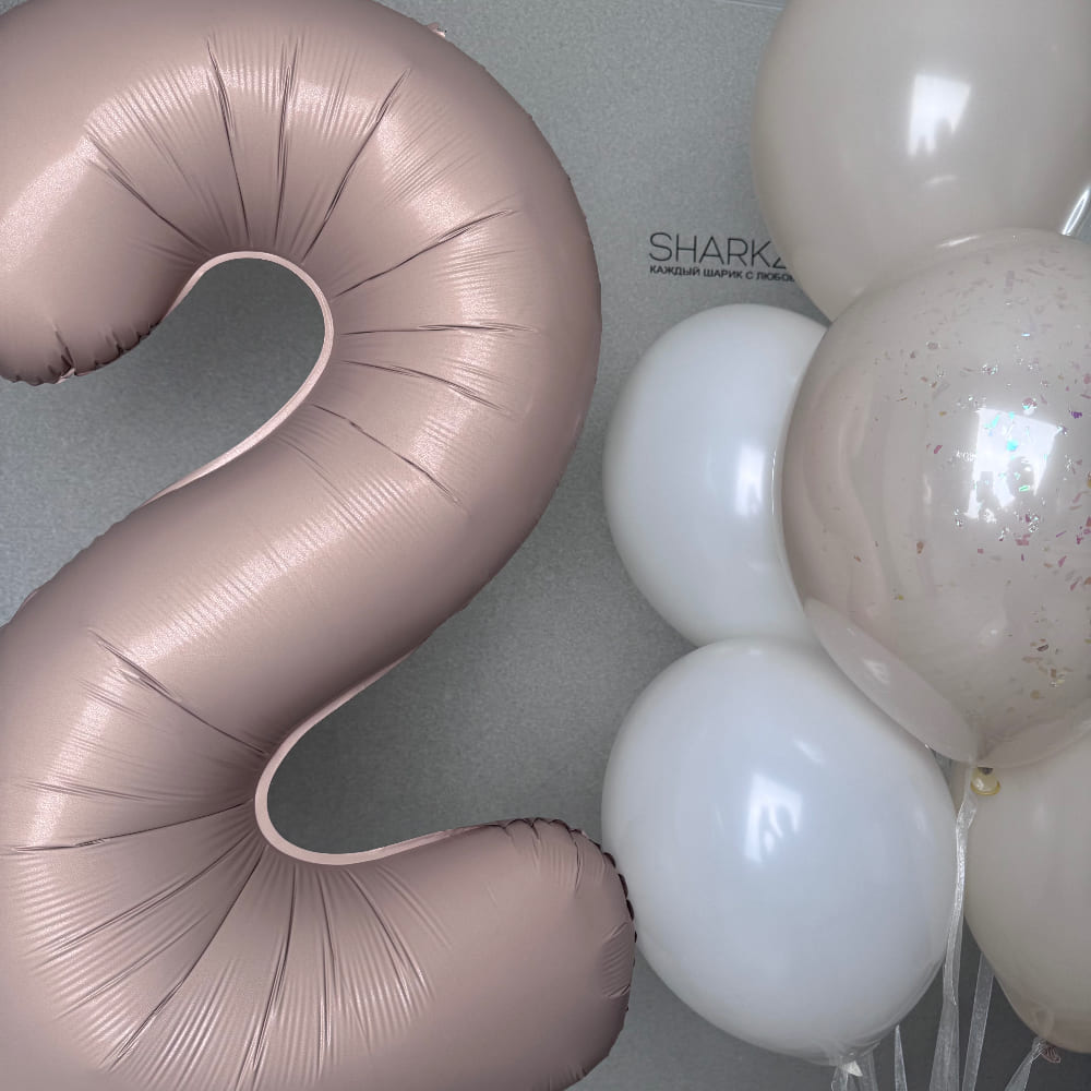 В центре композиции — большая метровая цифра 2 в благородном оттенке пыльной розы. Он выглядит сдержанно, но очень дорого и стильно. Вокруг цифры мы создаем легкую и воздушную связку в кремово-белой гамме. Мы добавили в нее модные «стеклянные» шары с серебряной крошкой, чтобы праздник заиграл благородным, ненавязчивым блеском.
