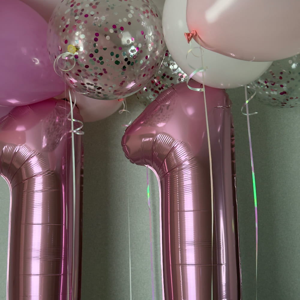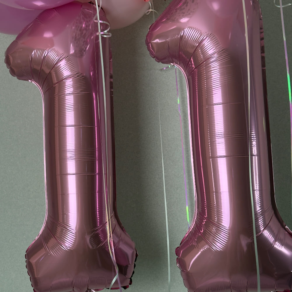 В центре композиции — две метровые цифры "11" в ярком и сочном цвете фламинго. Они выглядят стильно, современно и сразу задают настроение всему празднику. Над ними, под потолком, мы создаем легкое облако из 10 шаров, украшенных перламутровой лентой. Мы добавили прозрачные шары с конфетти, чтобы создать эффект мерцания и волшебства.