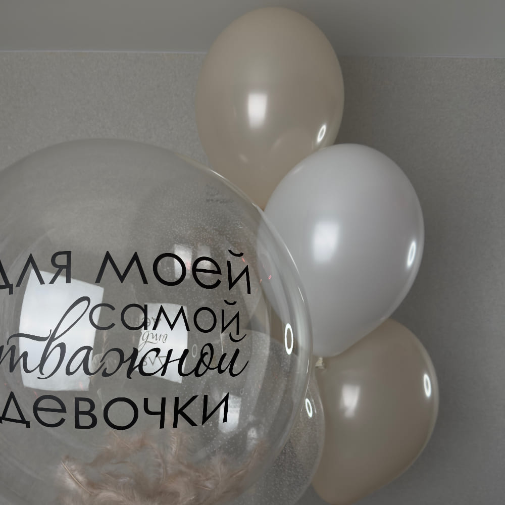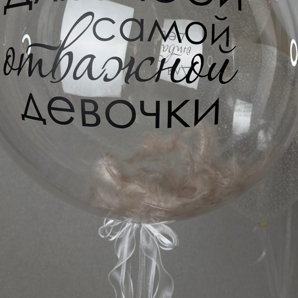 В центре композиции — прозрачный баблс, наполненный легкими перьями, с той самой вдохновляющей надписью. Вокруг него — веселая и яркая связка из шаров, среди которых есть необычные прозрачные шары с пенопластом внутри. Они выглядят динамично и нестандартно, подчеркивая жизнерадостный и смелый характер именинницы.