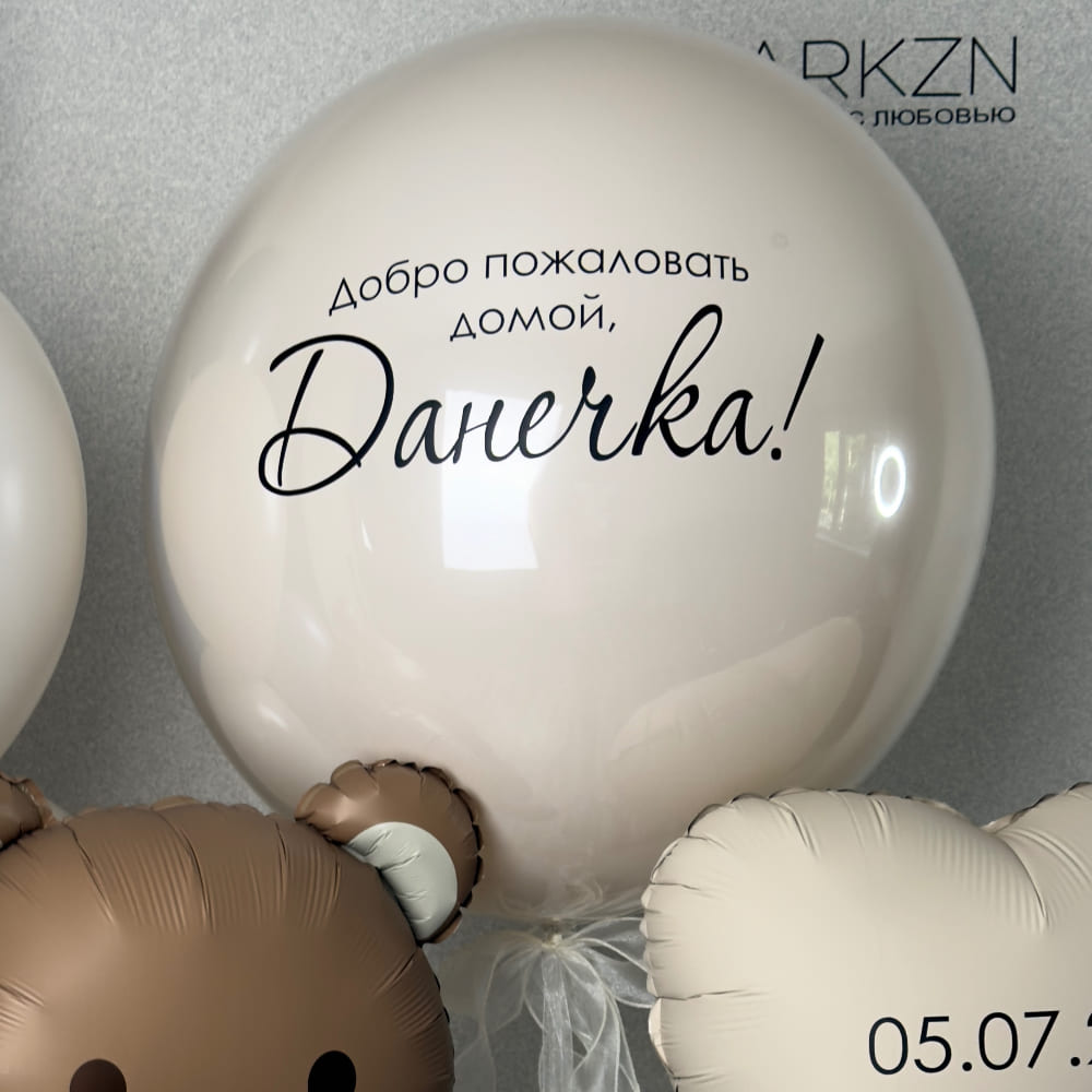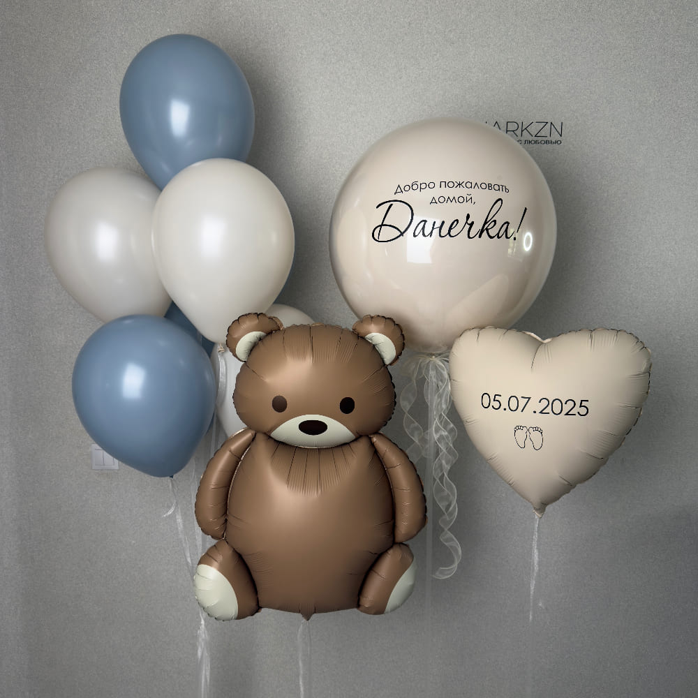 В центре этого персонального поздравления — большой стеклянный шар с трогательной надписью «Добро пожаловать домой, Данечка!». Рядом с ним — добрый фольгированный Медвежонок и нежное сердце, на котором мы разместим дату рождения и милый рисунок стопы малыша. Легкий фонтан из классических шаров создает атмосферу праздника и радости.