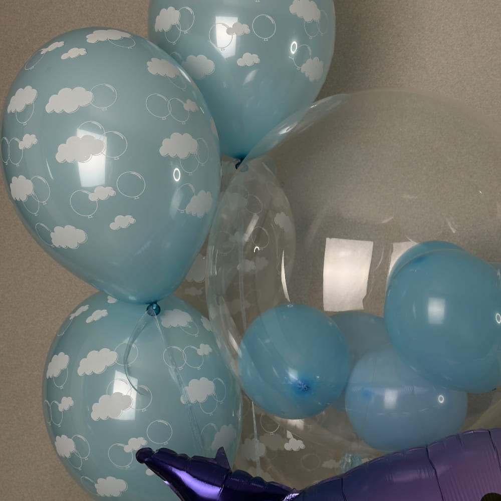 - Прозрачный Баблс с голубыми шариками и любой надписью