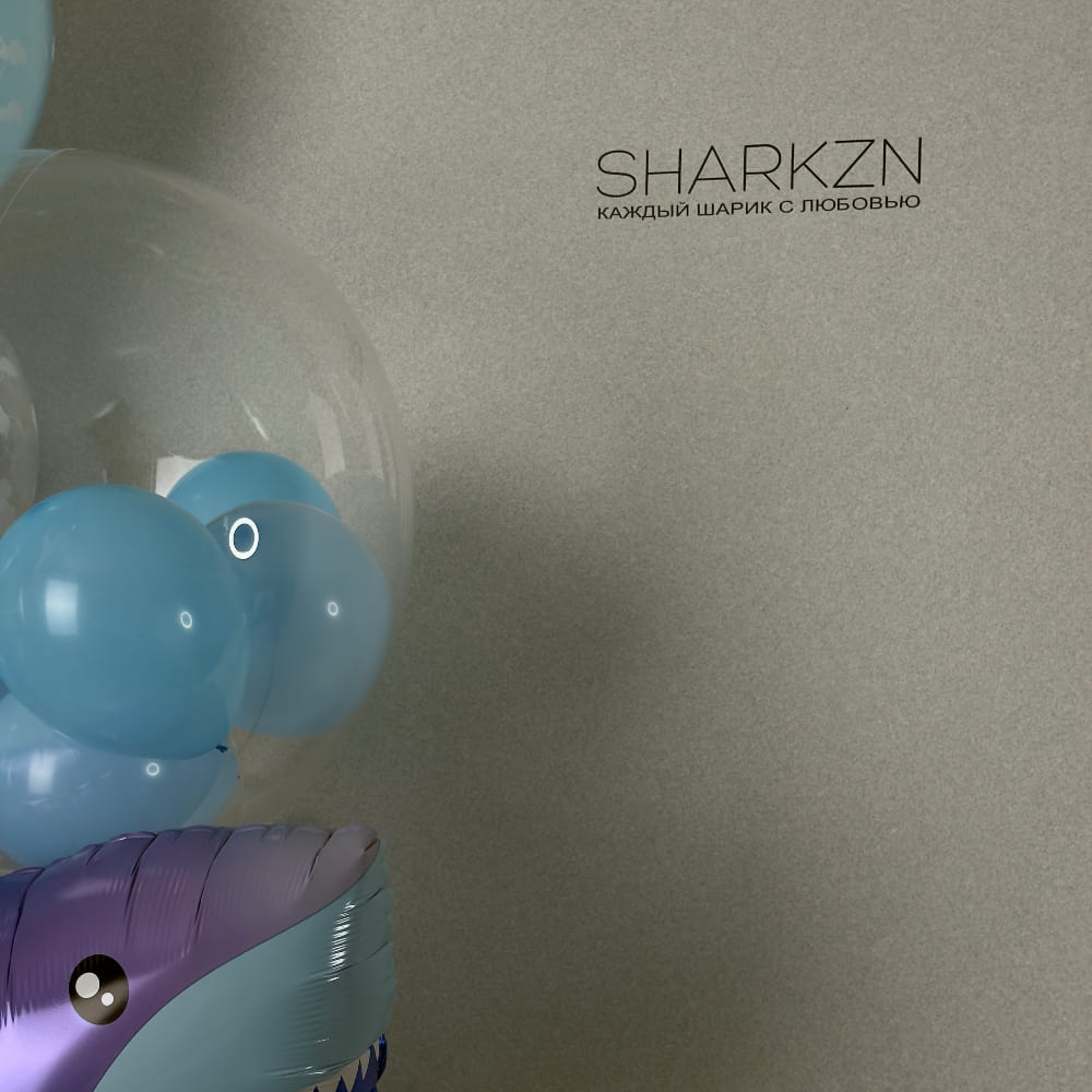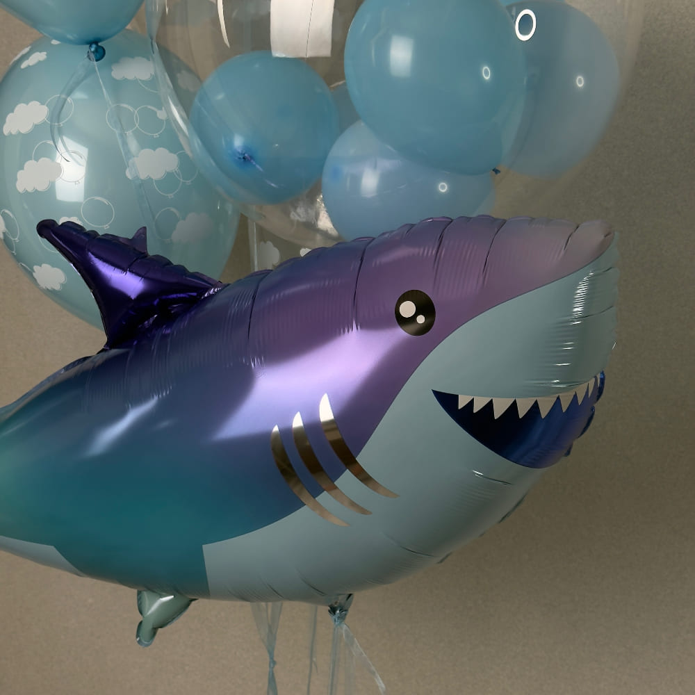 В центре этого морского приключения — большая фольгированная Акула. Она выглядит эффектно и сразу становится главным героем. Рядом с ней — прозрачный баблс, наполненный голубыми маленькими шариками, словно пузырьками в океане. На баблсе мы можем разместить любую надпись — имя именинника или поздравление. А вокруг них мы создаем связку из шаров с забавными морскими рисунками, которые дополнят тематическую картину.