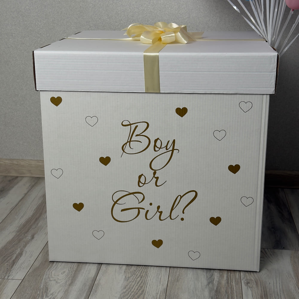 - Белая коробка 60*60*60см, золотой бант и индивидуальная надпись на коробку: Boy or Girl? + сердечки