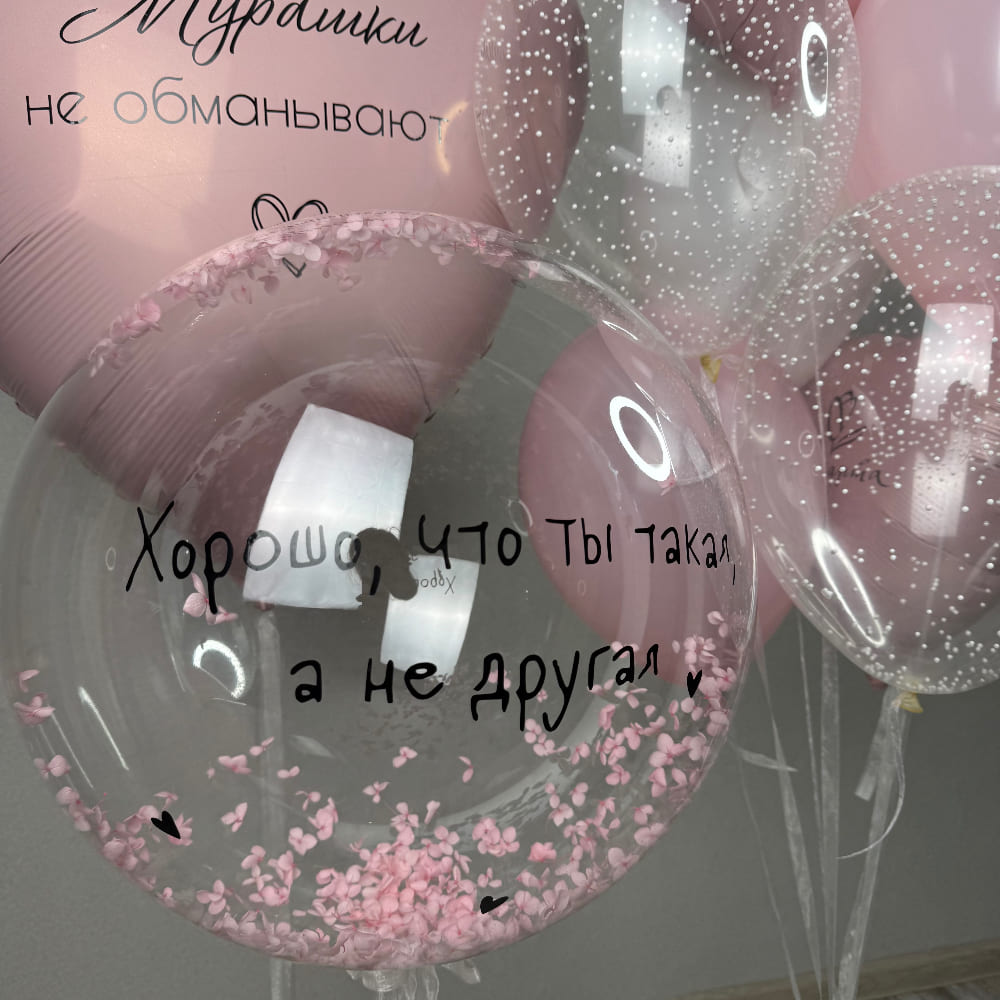Вы можете сделать этот набор еще более личным. Надписи на баблсе и на большом сердце могут быть любыми — под вашу историю. Цветовую гамму и наполнение баблса тоже легко изменить. Создайте тот самый уникальный подарок для самой уникальной девушки.