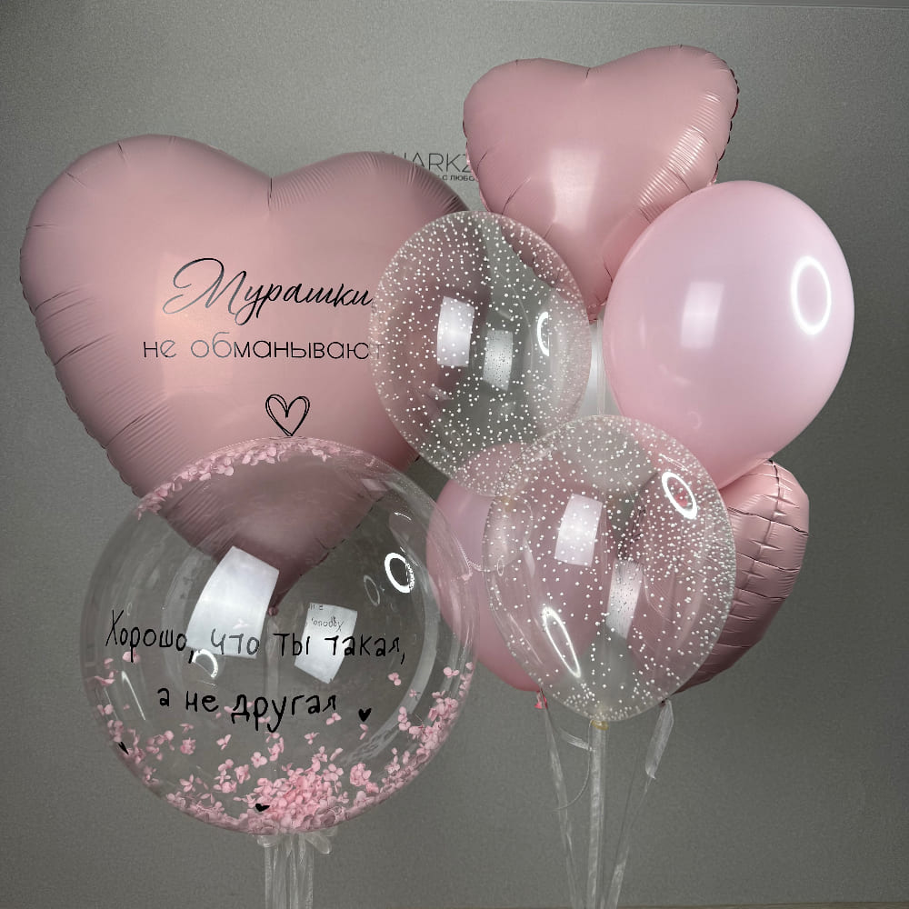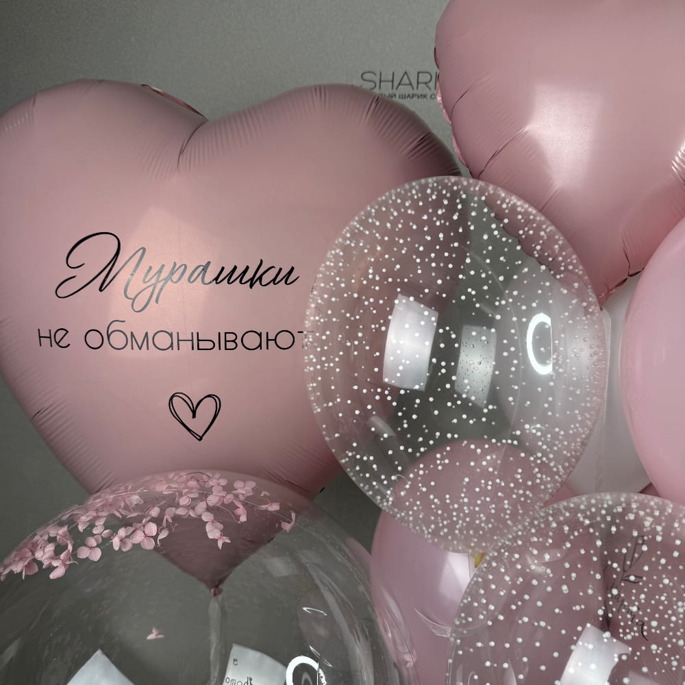 В центре этой дизайнерской композиции — прозрачный баблс с изящным наполнением из сухоцветов (например, гортензии) и трогательной черной надписью. Рядом с ним — большое розовое сердце с еще одним признанием: «Мурашки не обманывают». А завершает картину пышная связка, где мы собрали сердца, шары с пенопластом и классику. Это настоящий дизайнерский арт-объект.