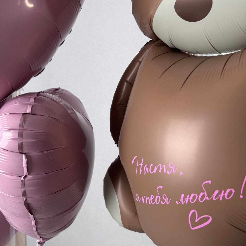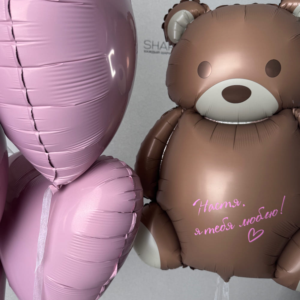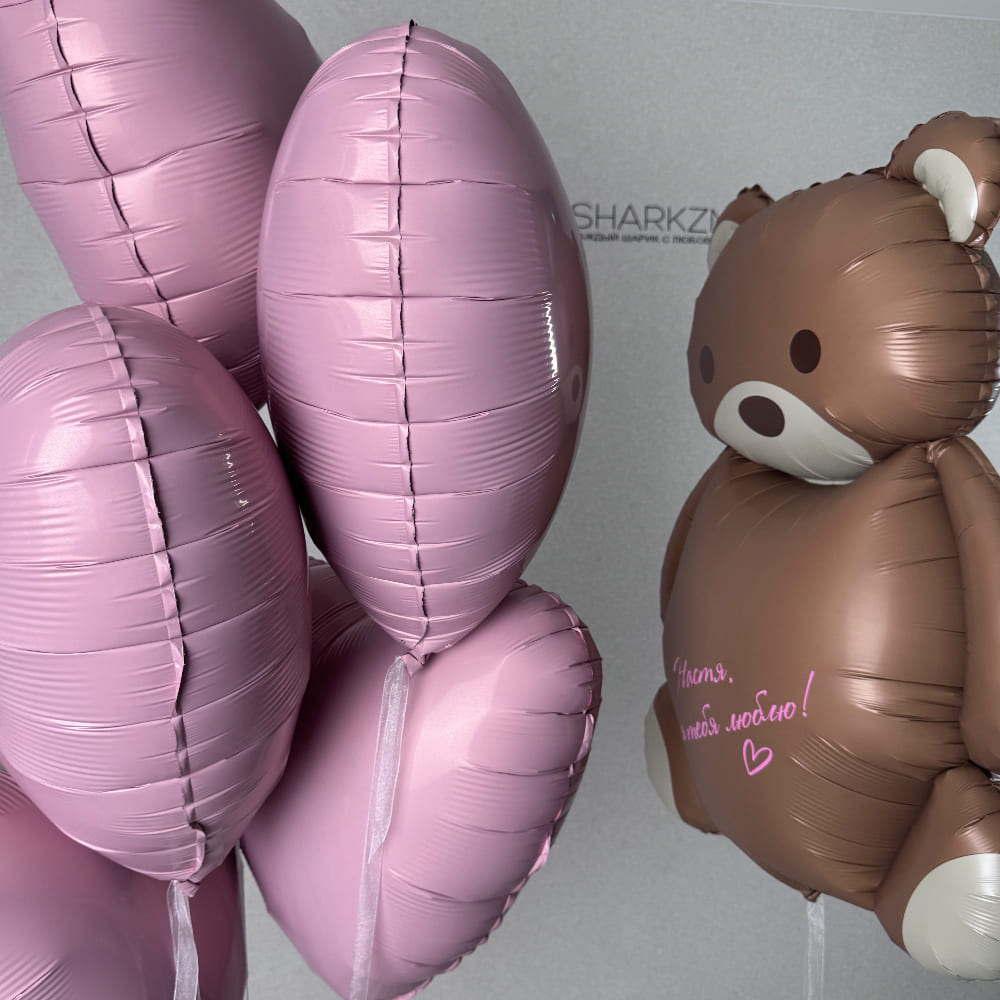 В центре этой элегантной композиции — фольгированный Мишка с персональной надписью на футболке. Рядом с ним — фонтан из пяти нежно-розовых фольгированных сердец. Минимализм, который говорит о многом. Здесь нет ничего лишнего, только вы, она и самые важные слова. Такая композиция не требует много места, но неизменно приковывает взгляды и дарит тепло.