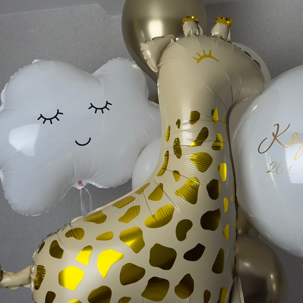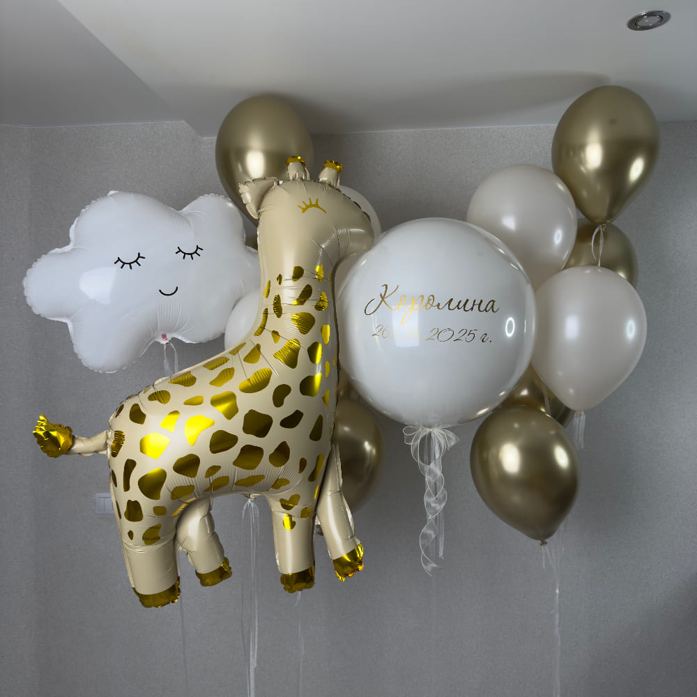 Высокий друг для вашего малыша! Забавный фольгированный Жирафик, символ доброты, мудрости и высокого роста, в компании воздушного Облака и большого приветственного шара — этот набор пожелает малышу расти большим, сильным и счастливым.