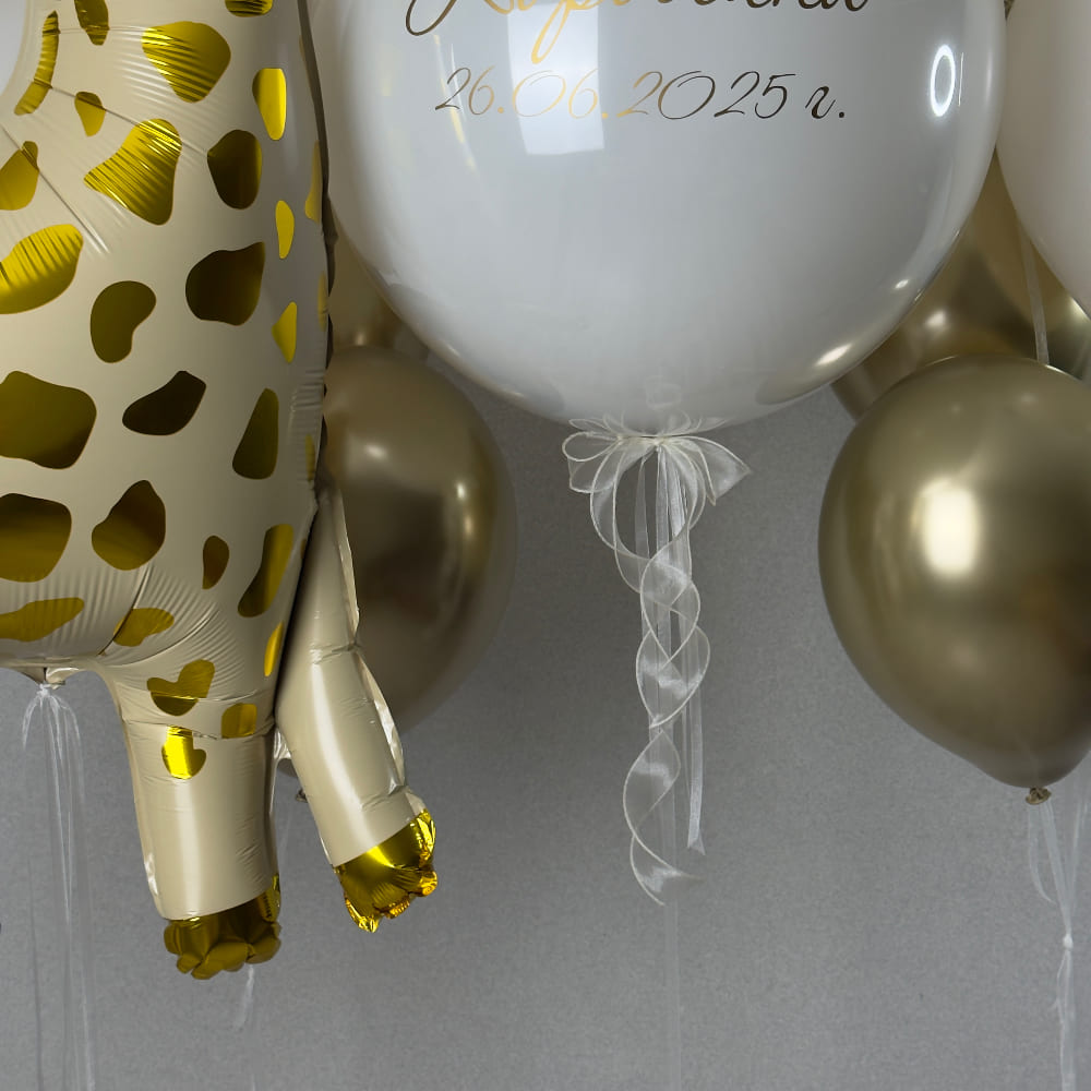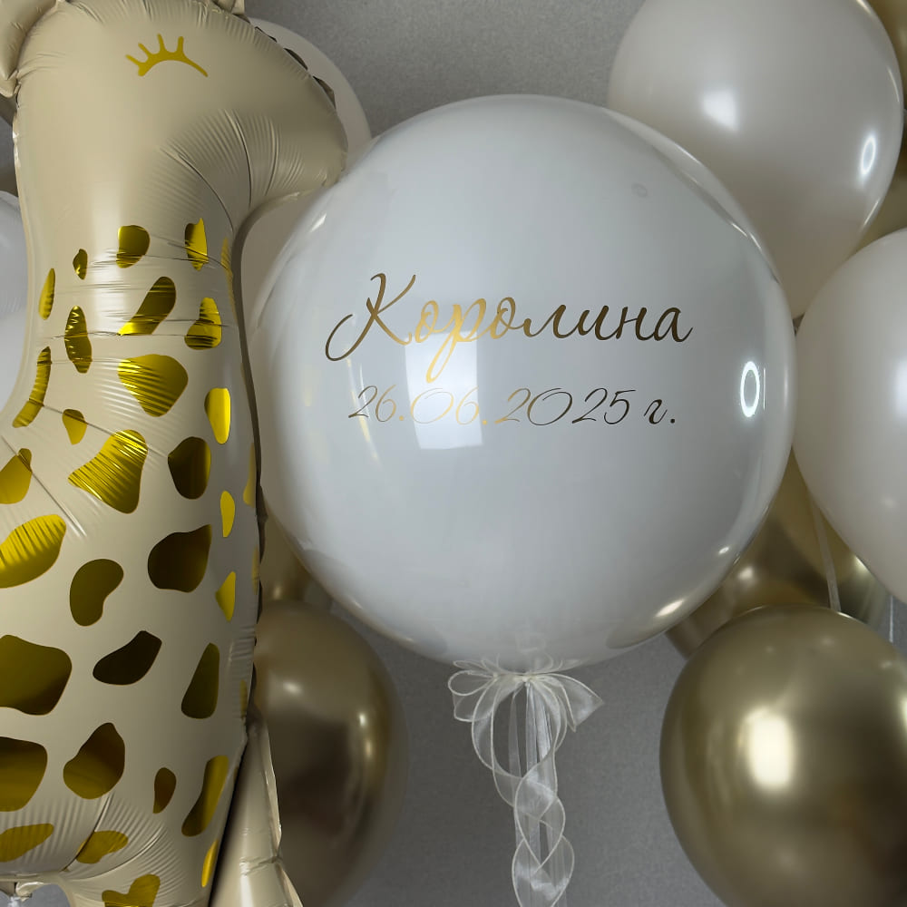 В центре этой веселой композиции — большой белый стеклянный шар с золотой надписью, на которой мы разместим имя и дату рождения малыша. Рядом с ним — милый Жирафик и легкое Облачко. А два пышных фонтана из 6 шаров, где классика и сияющий хром создают атмосферу настоящего праздника и радости.
