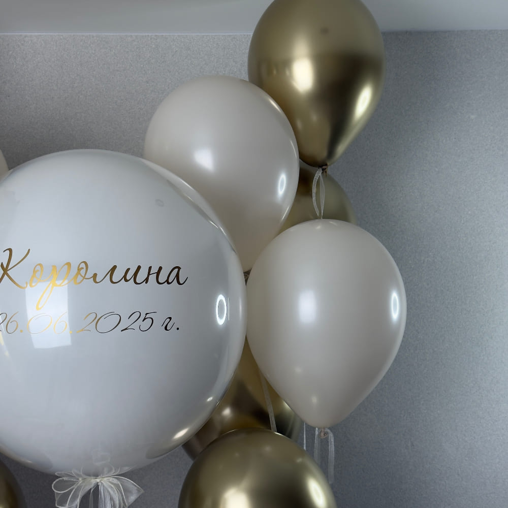 - Стеклянный белый шар с золотой надписью: Имя и дата рождения малыша