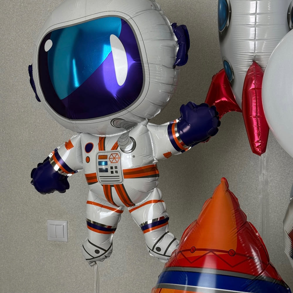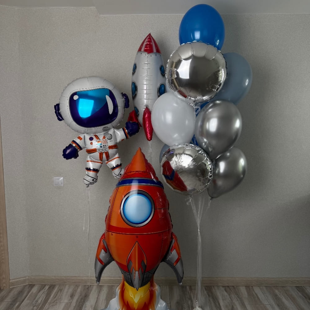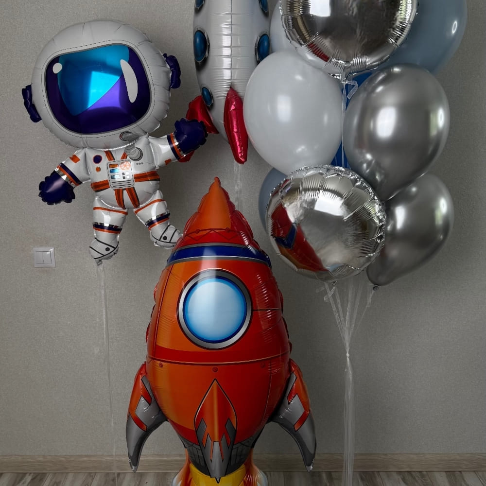 | Размер | Круглые шарики 30 см, Фольгированный космонавт 92 см, Фигура ракета 80 см, Фольга круги 46 см, Ракета Ходяка 126 см |