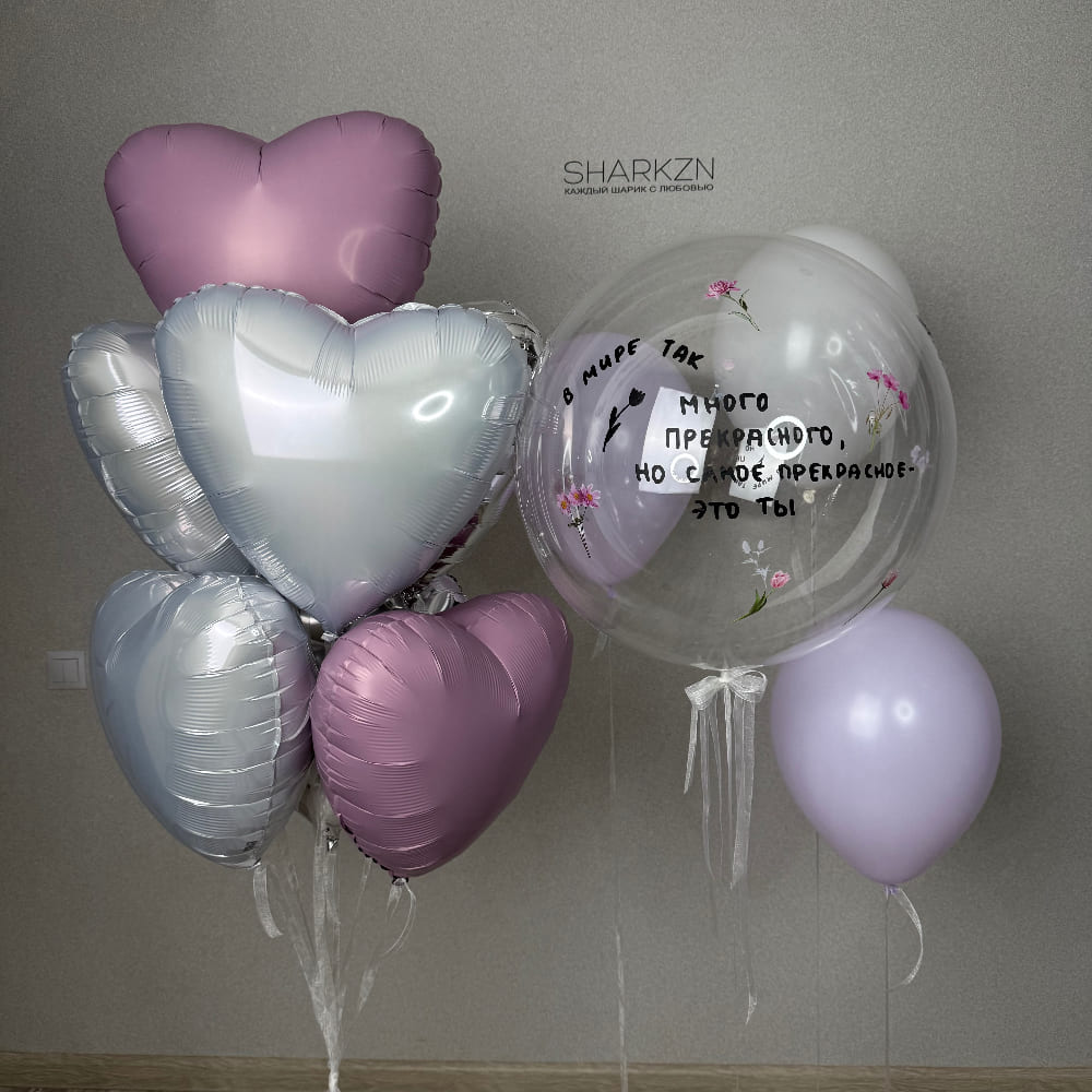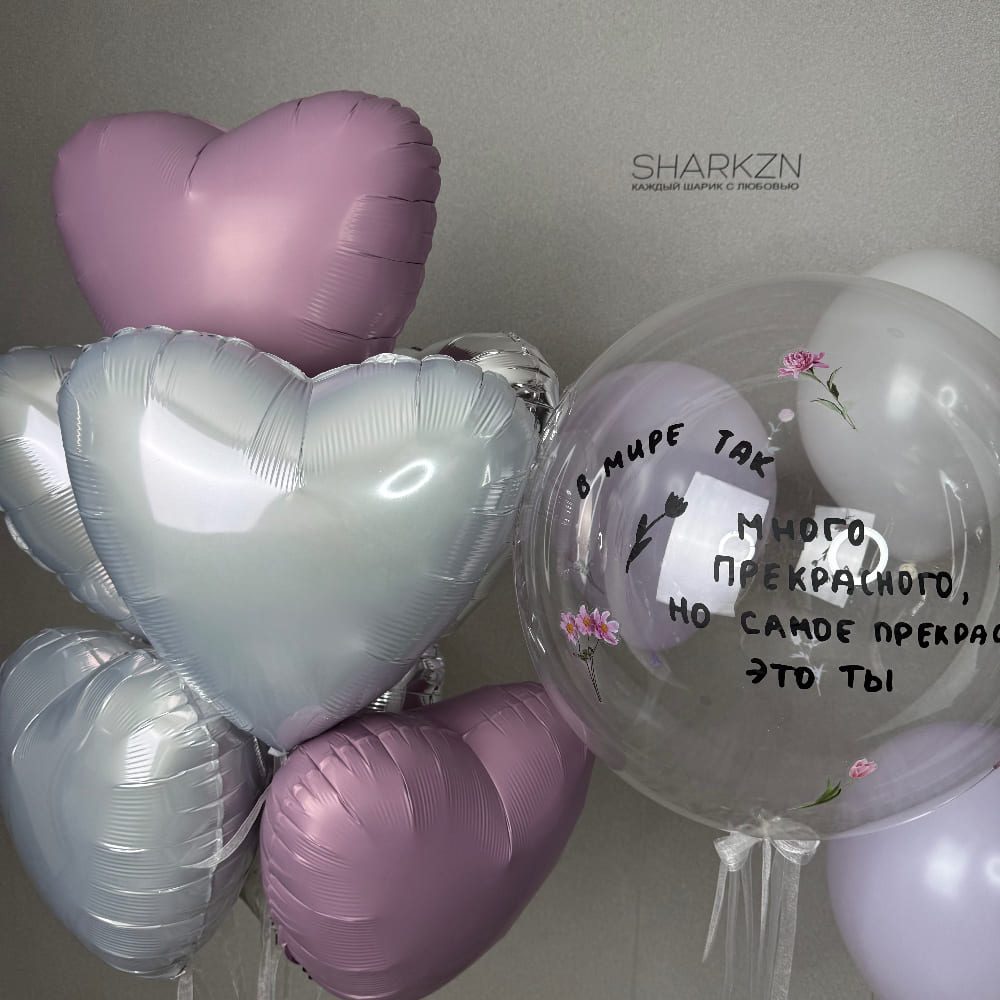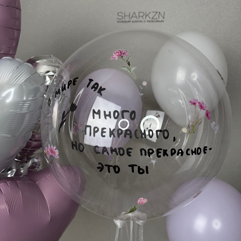 В центре этой композиции — большой прозрачный баблс, украшенный нежными рисунками и той самой трогательной надписью. Вокруг него мы создаем целый водопад из фольгированных сердец и воздушных шаров. Это создает эффект, будто весь мир подтверждает слова, написанные на баблсе.