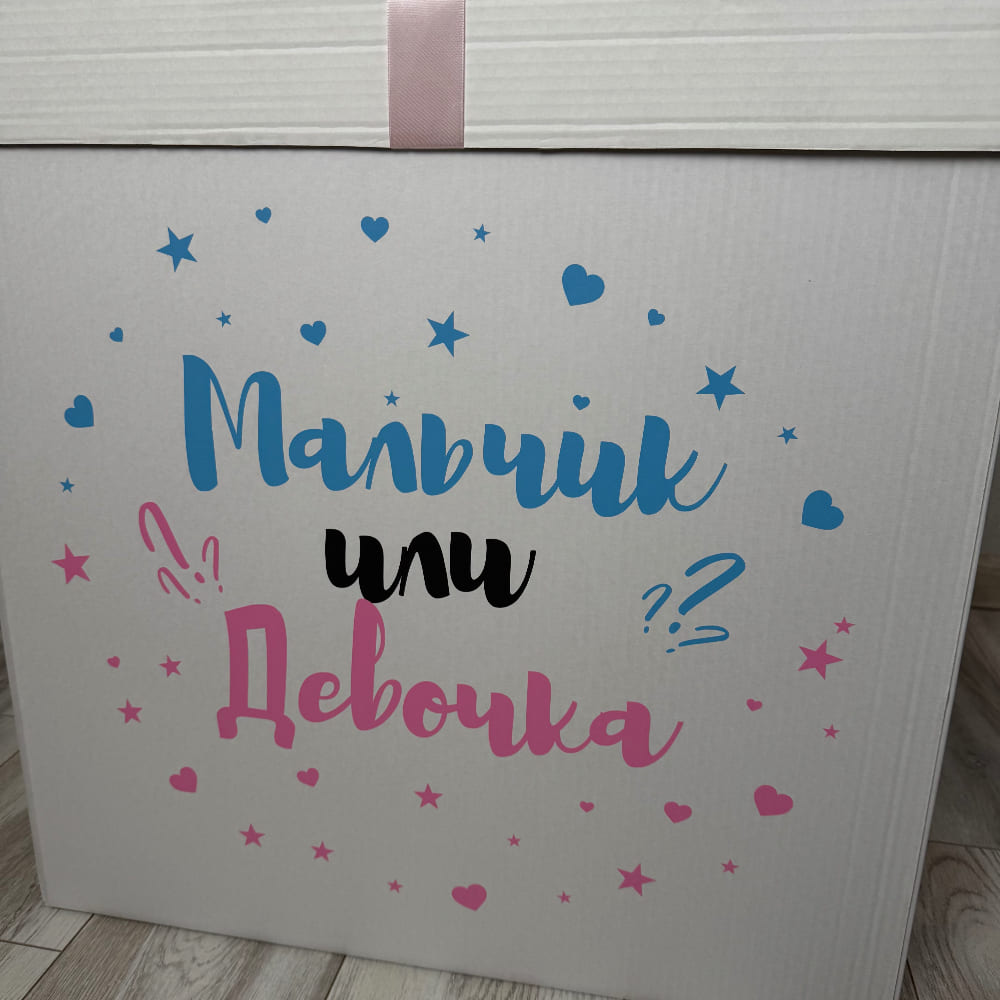- Белая коробка 60*60*60см, цветной бант и индивидуальная цветная надпись на коробку: Мальчик или девочка? + звездочки и сердечки