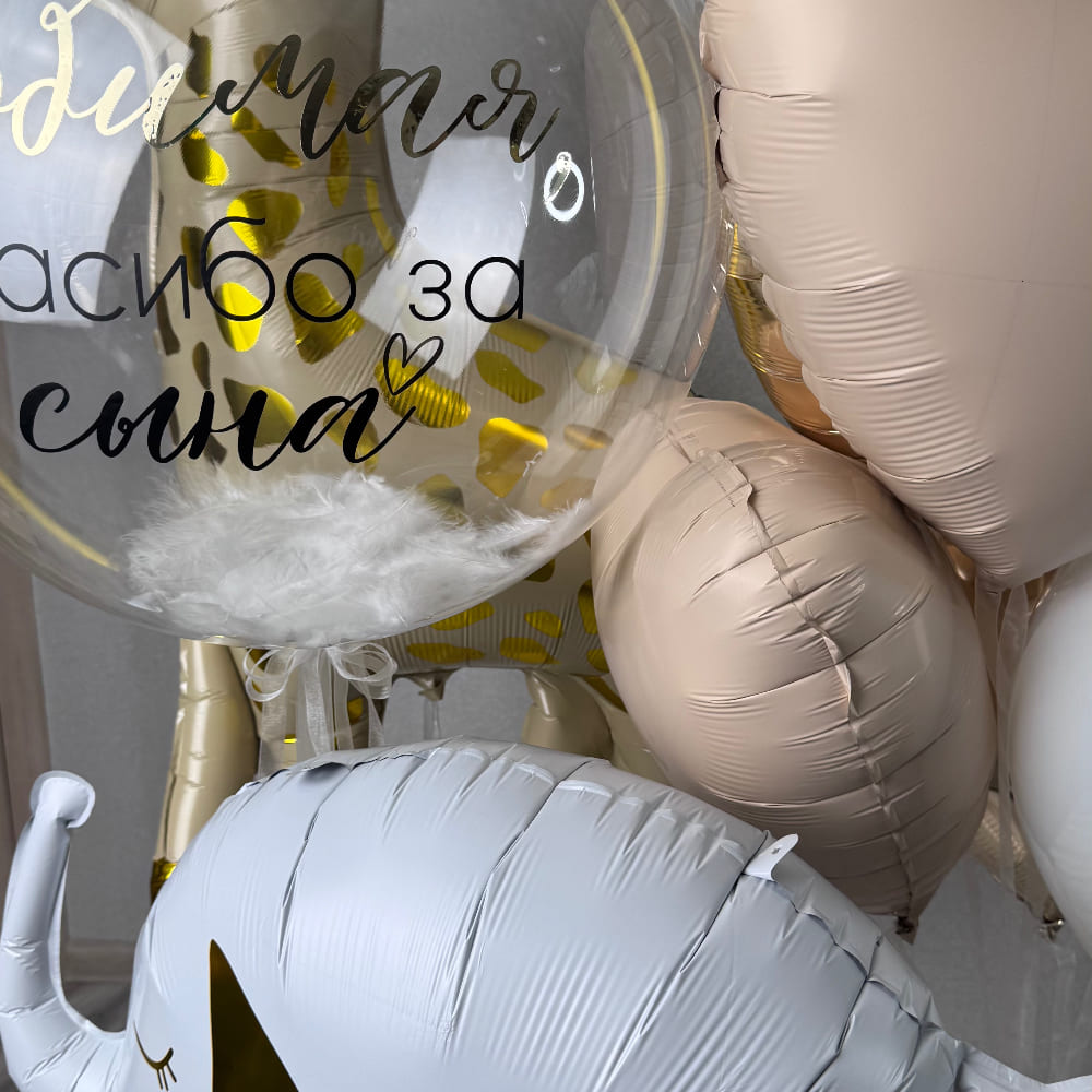 - Прозрачный Баблс с белыми перышками и черной надписью: Любимая, спасибо за сына
