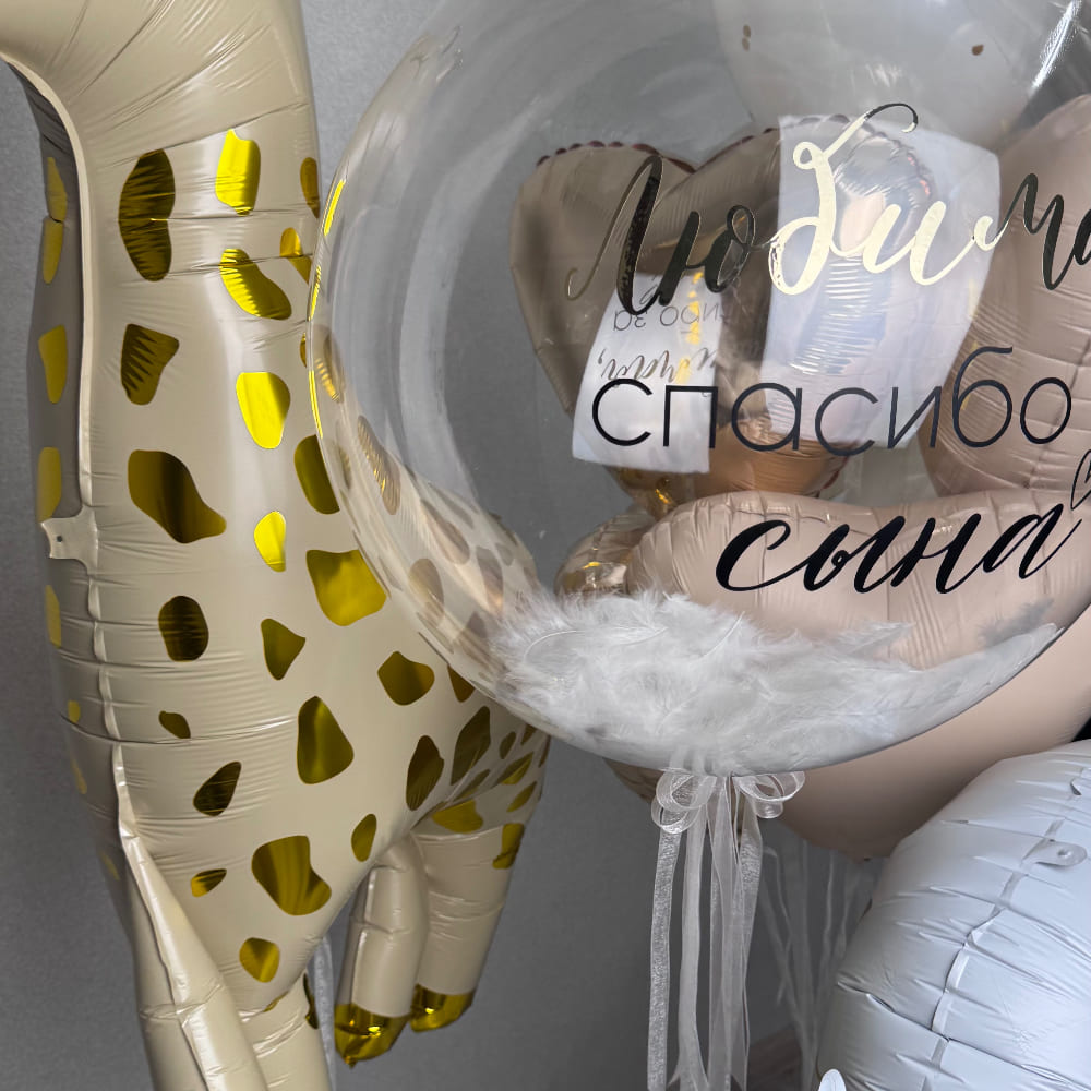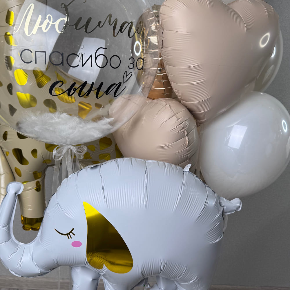 | Тип материала | Баблс из пластика, Сердце, Слоник, Жирафик из фольги, Круглые шары из натурального латекса |