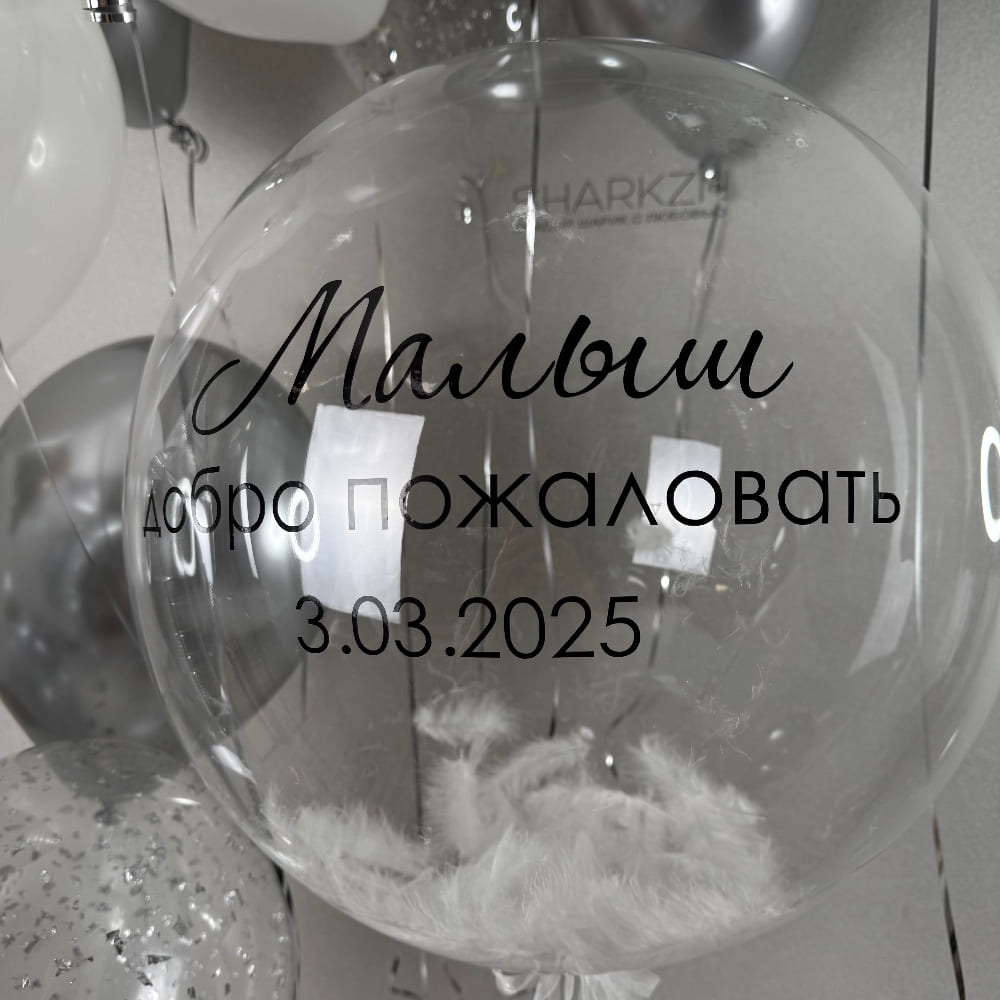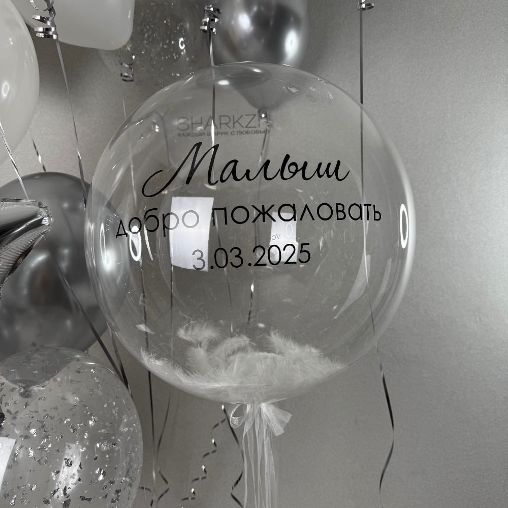 Имя малыша и надпись на баблсе — любые. Встречайте Ваше счастье с распростёртыми объятиями и красивыми шарами.