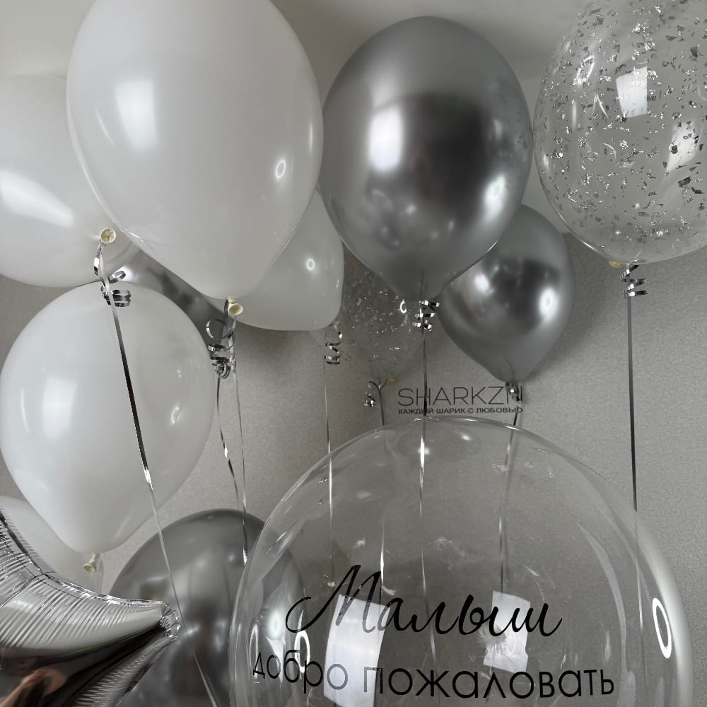 В центре этого теплого приема — большой прозрачный баблс с белыми перьями и той самой трогательной надписью, которую мы можем сделать любой. Рядом с ним — стильный фонтан из шаров, где сияющая серебряная звезда, хром, прозрачные шары с конфетти и классика создают ощущение праздника и радости. А над всем этим под потолком парит легкое облако из 8 шаров, создавая объем и наполняя комнату воздухом.