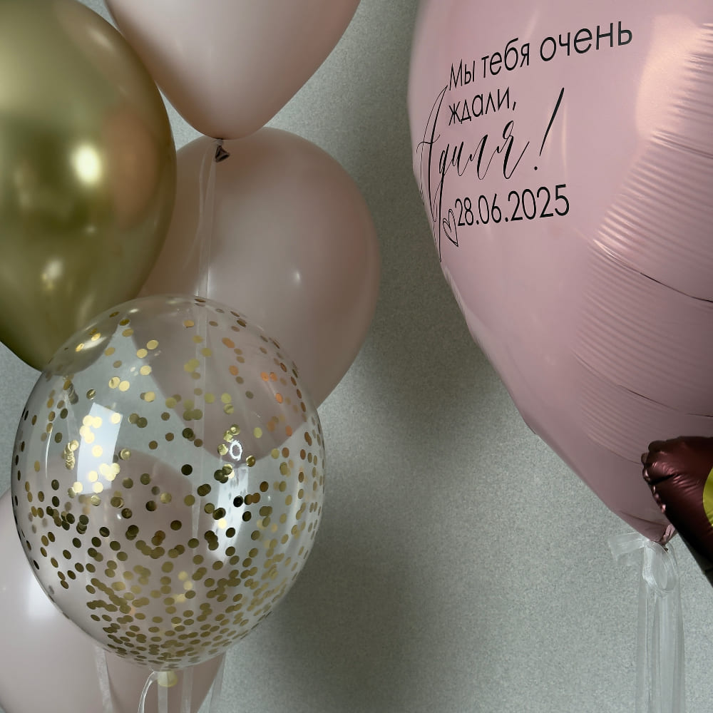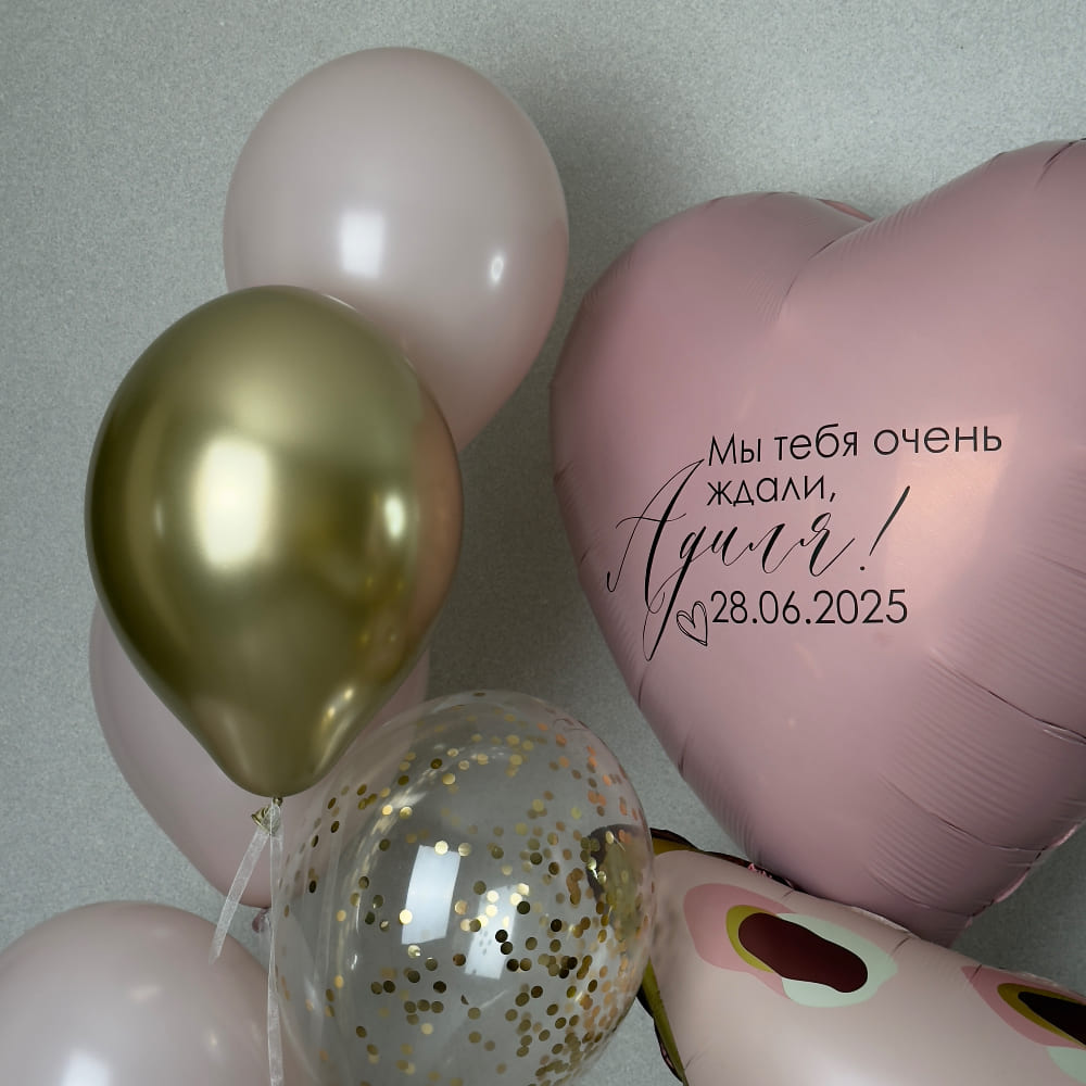 В центре этой душевной композиции — большое розовое сердце с персональной надписью, которую мы можем сделать любой — например, «Мы тебя очень ждали, Адиля!». Рядом с ним — изящная фольгированная Бабочка, символ легкости и новой жизни. А легкий фонтан из шаров в нежных тонах дополняет картину, создавая атмосферу тепла и любви.