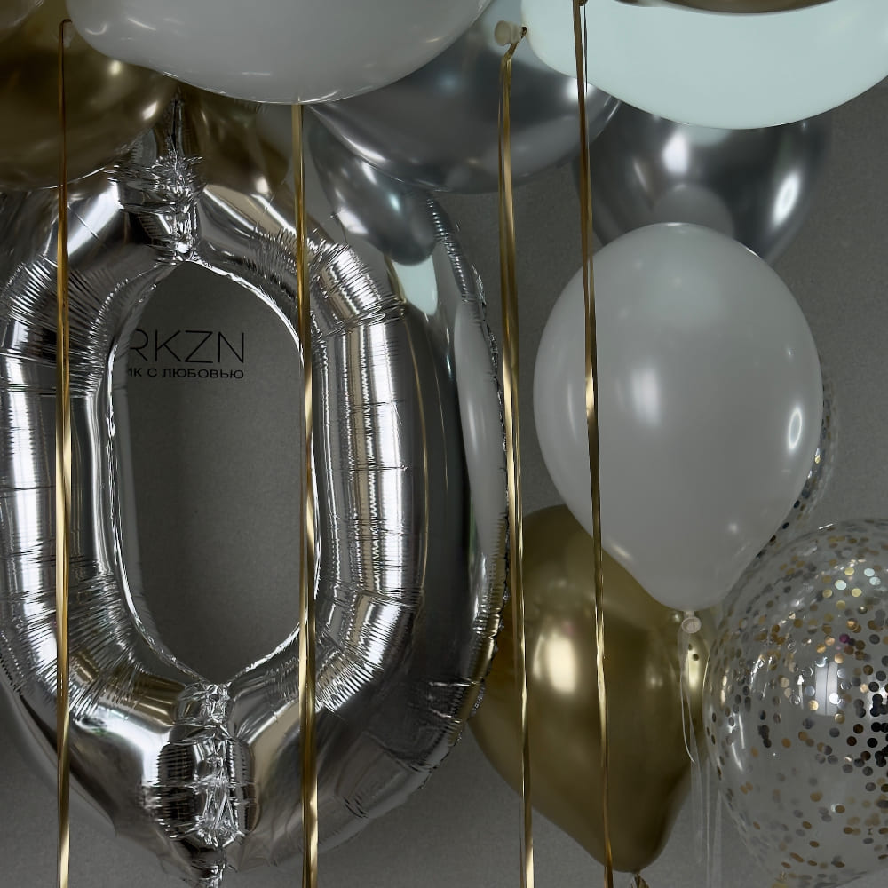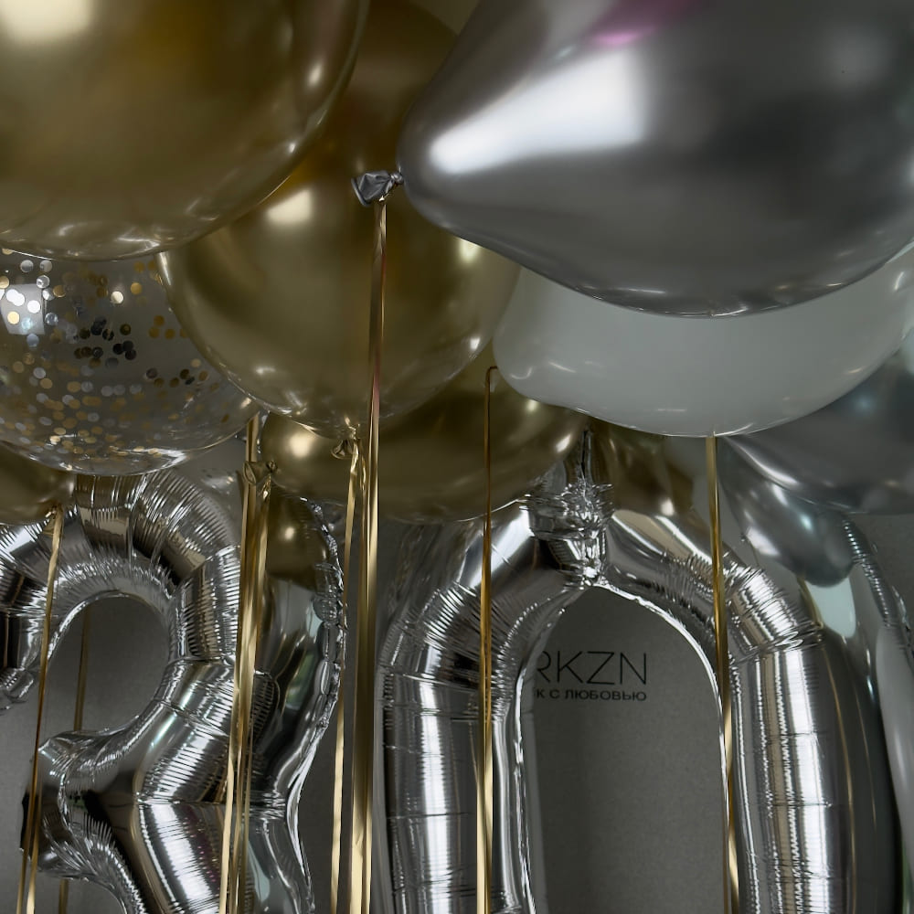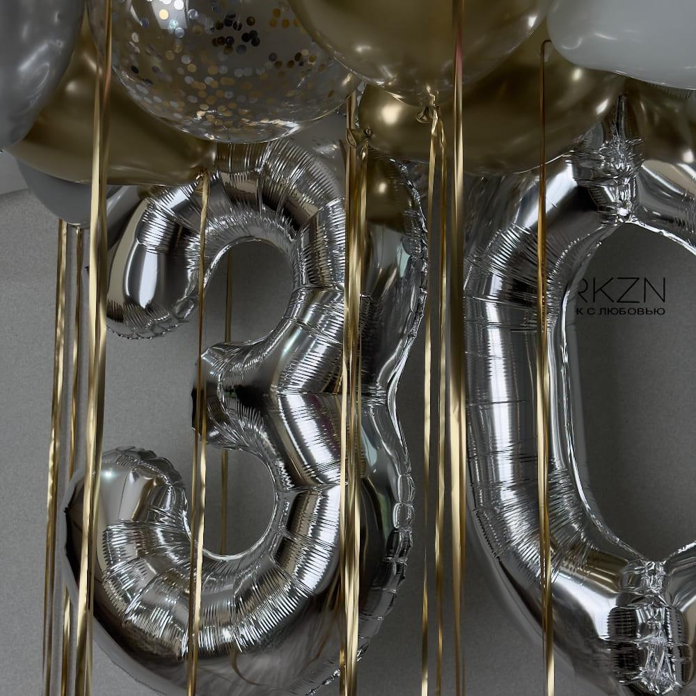 В центре композиции — солидные серебряные метровые цифры "3" и "0". Они являются главным акцентом. Рядом с ними — элегантная небольшая связка у пола. А над всем этим великолепием под потолком мы создаем целое облако из 15 шаров, украшенных золотым дождиком. Это создает мощное, объемное оформление, которое преобразит любое пространство.