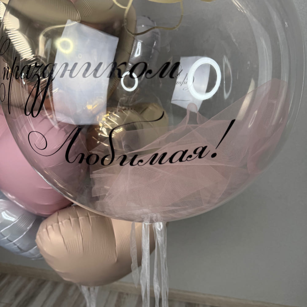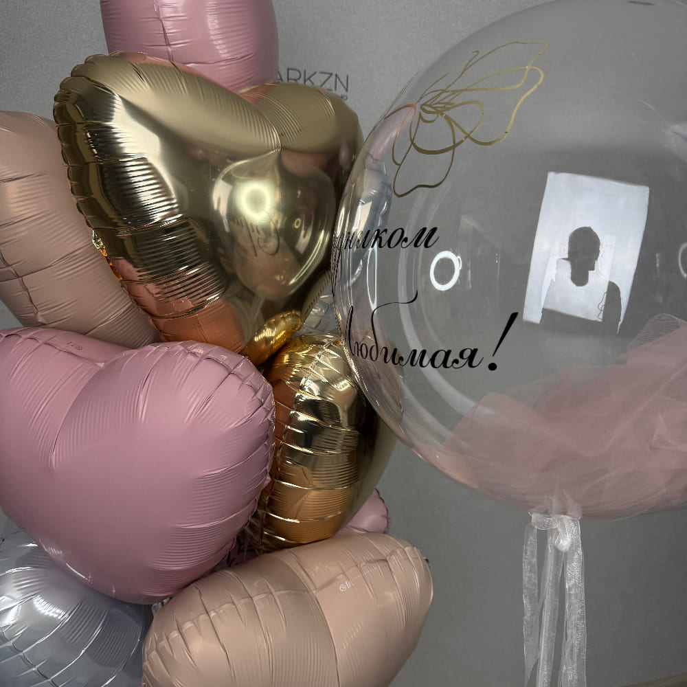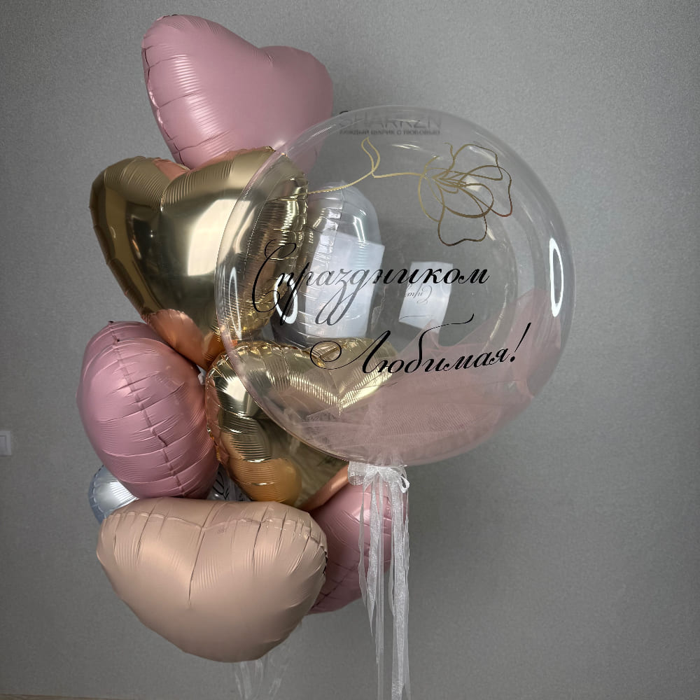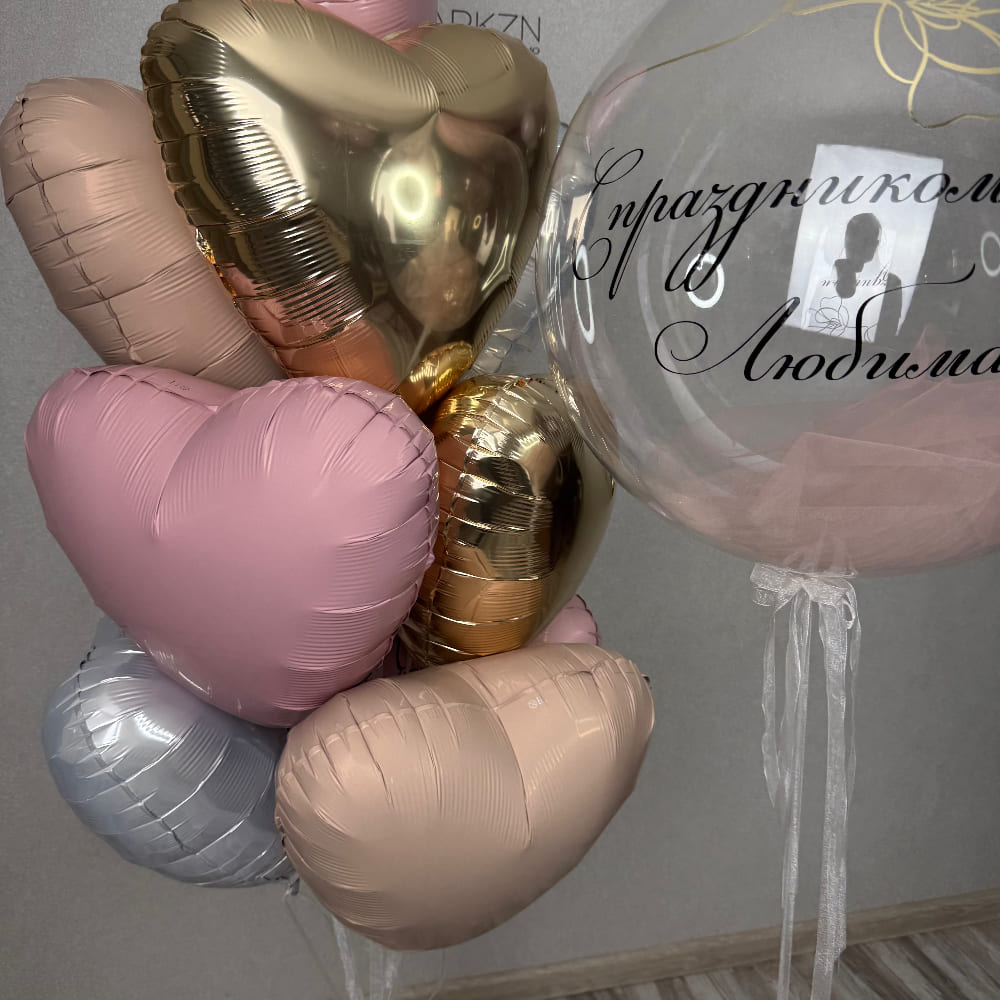 В центре композиции — большой прозрачный баблс, наполненный нежным розовым фатином, с элегантной черной надписью. Фатин создает ощущение легкости, воздушности и праздничного шика. Вокруг баблса мы создаем пышный фонтан из 10 фольгированных сердец, которые усиливают посыл и делают композицию богатой и объемной.