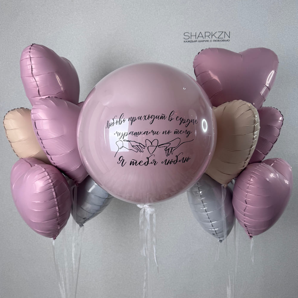 В центре этого роскошного набора — большой стеклянный шар с вашей индивидуальной надписью. Он — сердце всей композиции. Вокруг него мы создаем два пышных фонтана, по 5 фольгированных сердец каждый. Эффект двойного признания создает ощущение, что любовь окружает ее со всех сторон. Это богато, симметрично и невероятно эффектно.