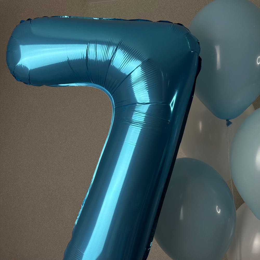 В центре композиции — большая метровая цифра 7 ярко-голубого цвета. Она сразу обозначает возраст именинника. Вокруг цифры мы создаем простую, но очень эффектную связку из пяти разноцветных шаров. Яркие цвета сразу привлекают внимание и дарят позитивные эмоции.