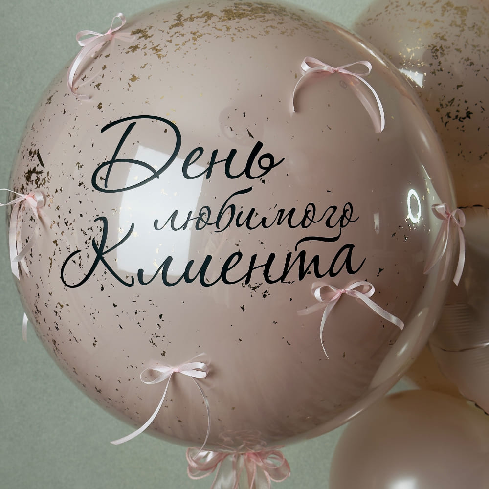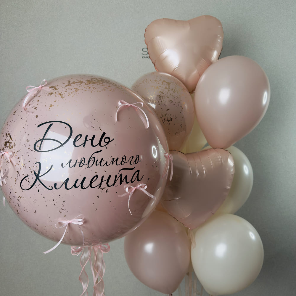 Вы можете персонализировать этот шедевр. Надпись на большом шаре может быть любой — имя, поздравление, признание. Цвет бантиков и всей гаммы тоже легко изменить. Сделайте подарок со вкусом — выберите этот элегантный набор.