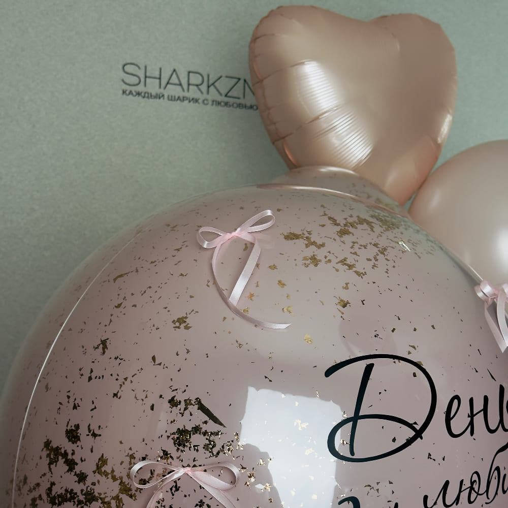 В центре композиции — большой розовый стеклянный шар, наполненный золотым конфетти, с элегантной черной надписью. Но главный акцент здесь — это 10 изящных атласных бантиков, которые украшают шар, делая его невероятно модным и уникальным. Вокруг него мы создаем пышный фонтан, где стандартные шары, прозрачные шары с конфетти и нежные сердца создают идеальную гармонию.