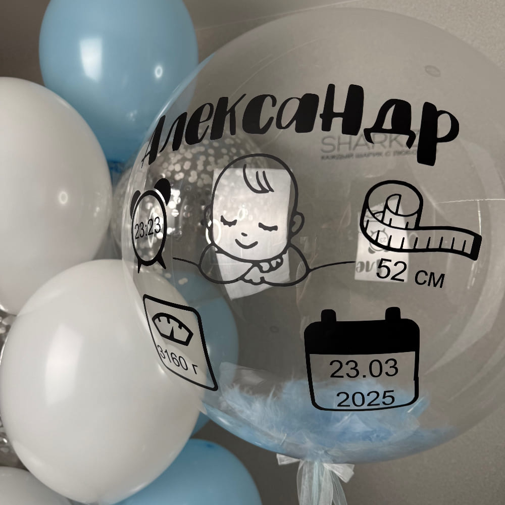 Имя и данные на шаре — любые. Пусть первые фотографии малыша будут в современном стиле.