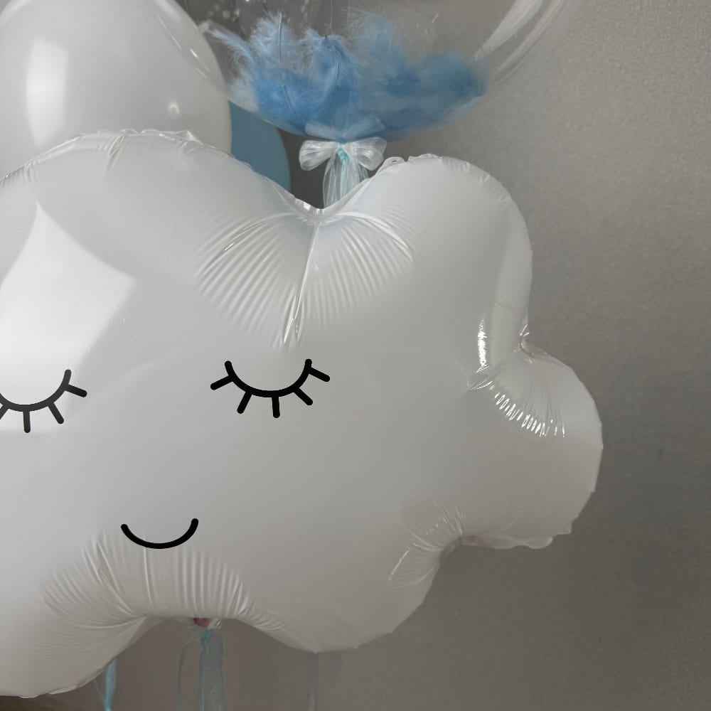 В центре композиции — большой прозрачный баблс, наполненный голубыми перьями, с элегантной черной надписью. На нем мы разместим все важные данные о малыше. Рядом с баблсом парит легкое фольгированное Облачко, символ нежности и спокойствия. А пышный фонтан из 10 шаров, среди которых есть прозрачные шары с серебряным конфетти, создает атмосферу настоящего праздника.