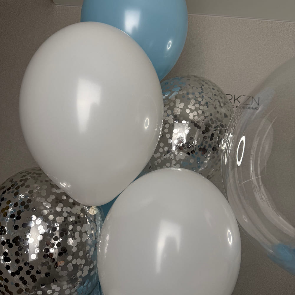 - Фонтан из10 шаров: 7 стандартных, 3 прозрачных с серебряным конфетти