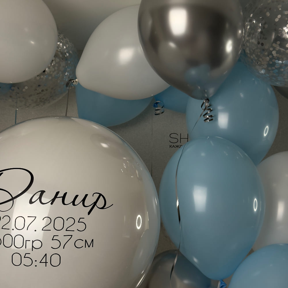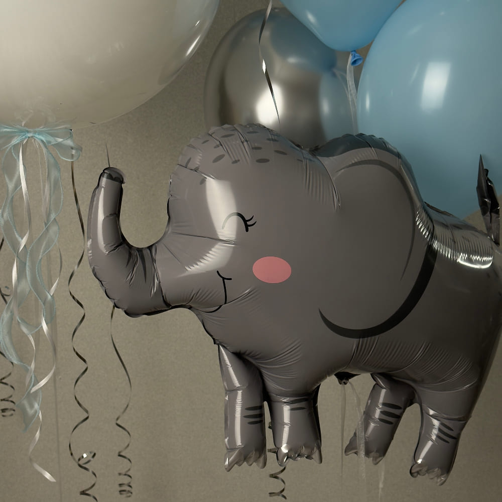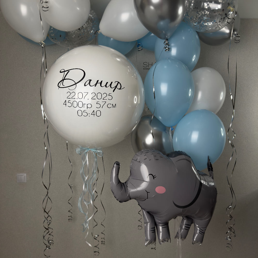 В центре композиции — большой белый стеклянный шар с черной надписью, на которой мы разместим имя, дату, рост, вес и время рождения малыша. Рядом с ним — величественный и добрый фольгированный Слонёнок. Вокруг них — пышный фонтан из 7 шаров и облако из 10 шаров под потолком с серебряной лентой, создающие атмосферу настоящего, масштабного праздника.