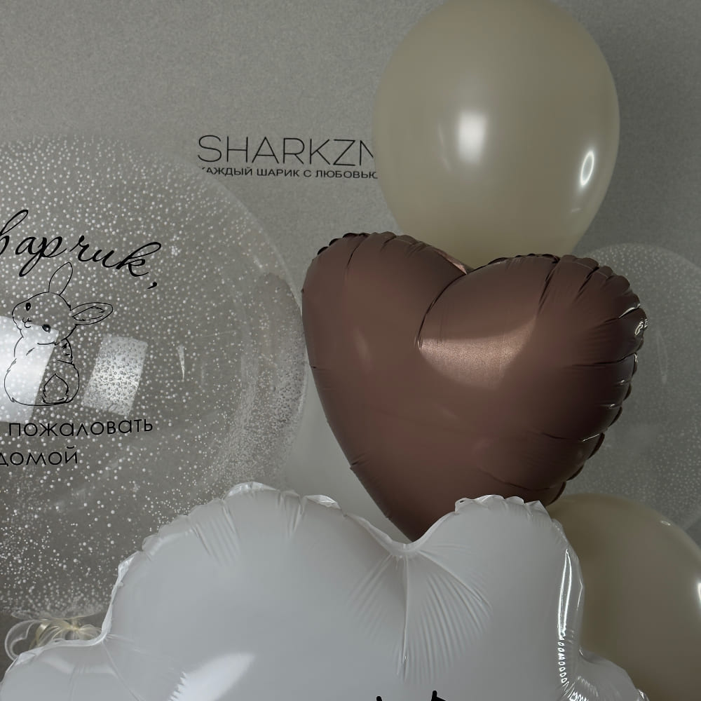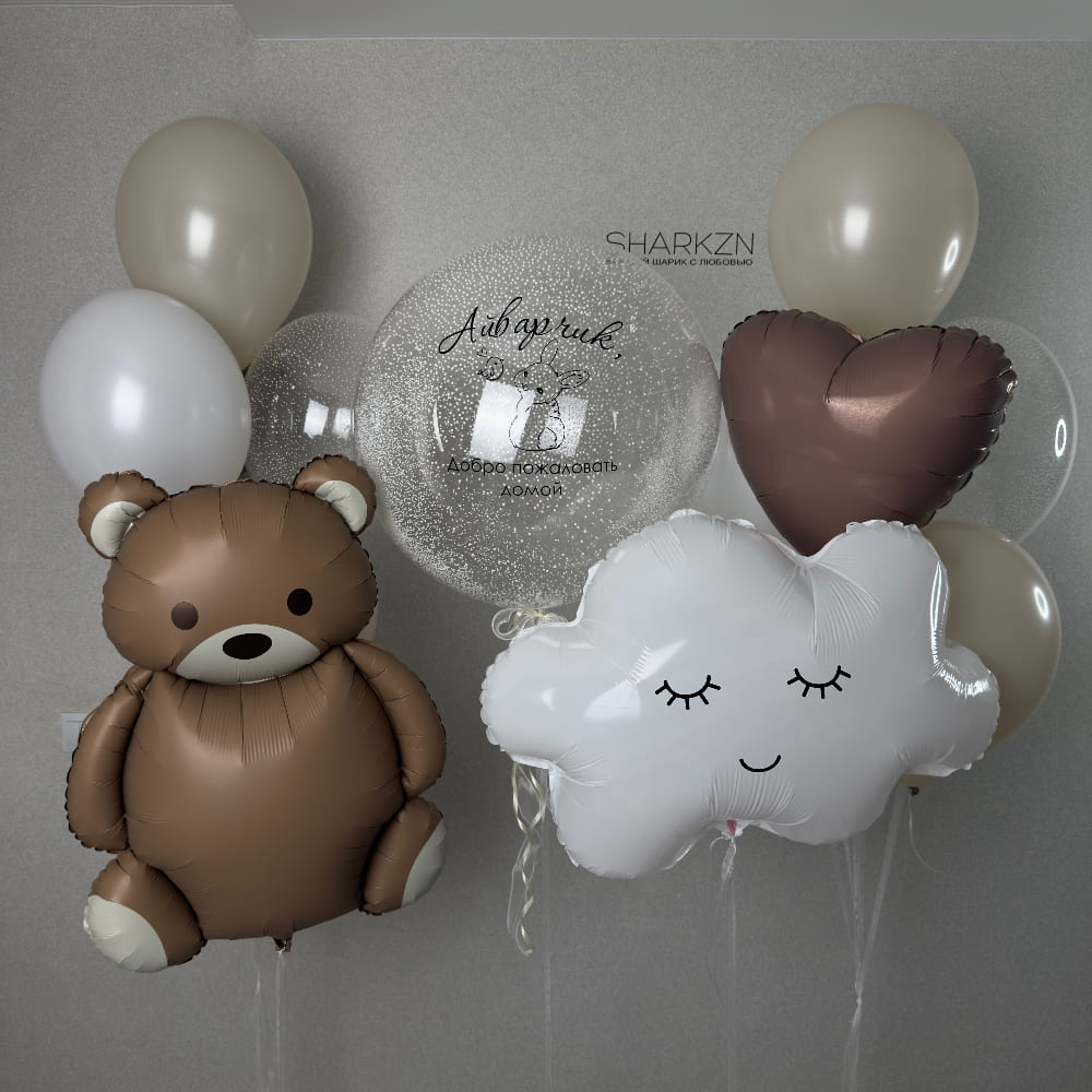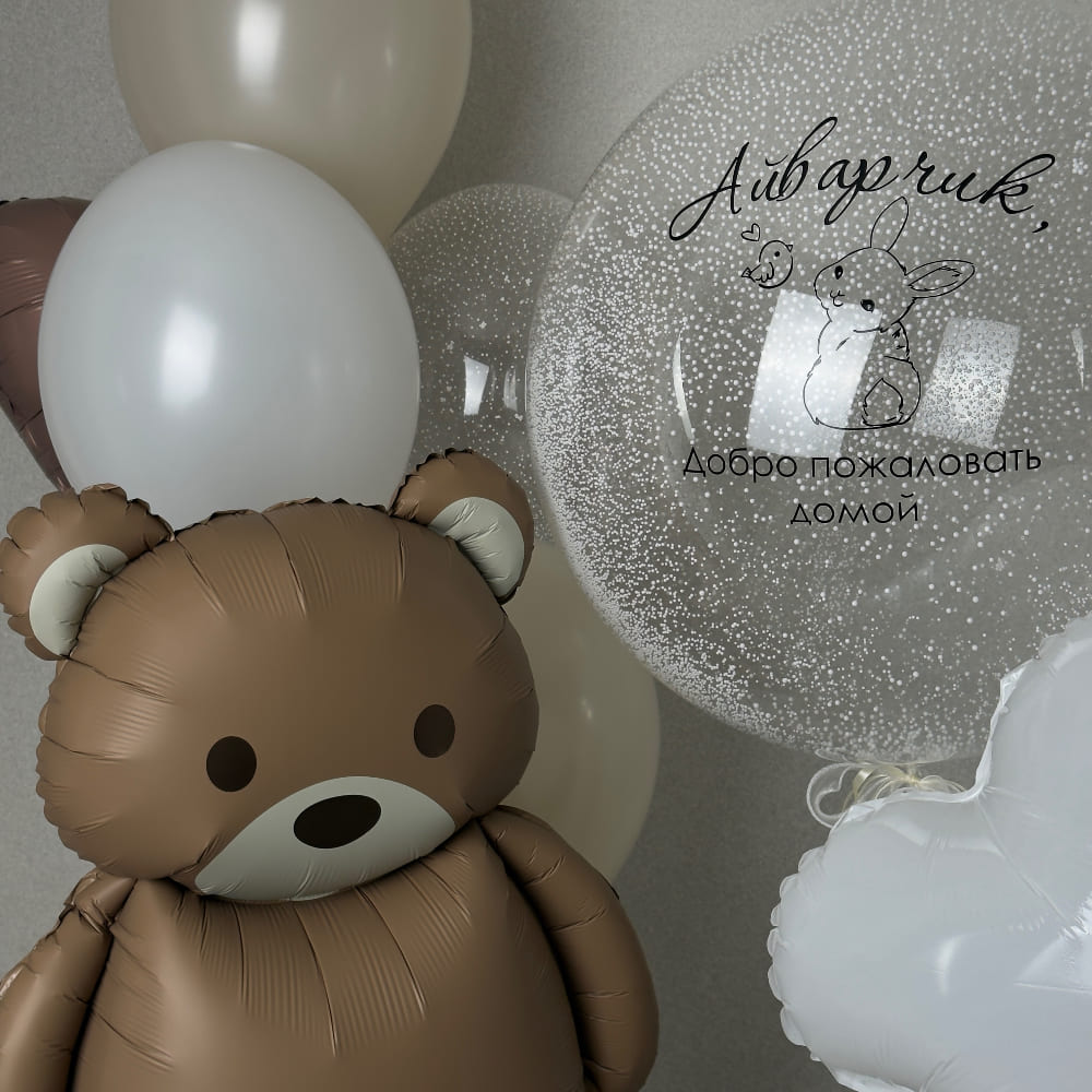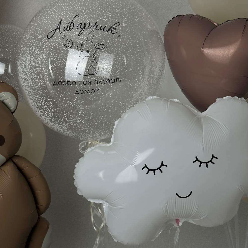 В центре этой стильной композиции — большой прозрачный баблс с пенопластом и надписью, на которой мы разместим имя малыша и трогательное «добро пожаловать домой» с милым рисунком Зайчика. Рядом с ним — легкое Облачко и добрый Медвежонок. А два пышных фонтана из 7 шаров, где классика, нежные сердца и прозрачные шары с пенопластом создают атмосферу настоящего праздника.