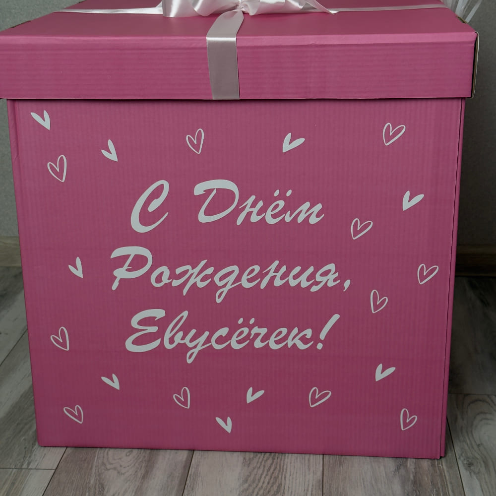 - коробка фуксия 60*60*60см, белый бант и индивидуальная белая надпись на коробку