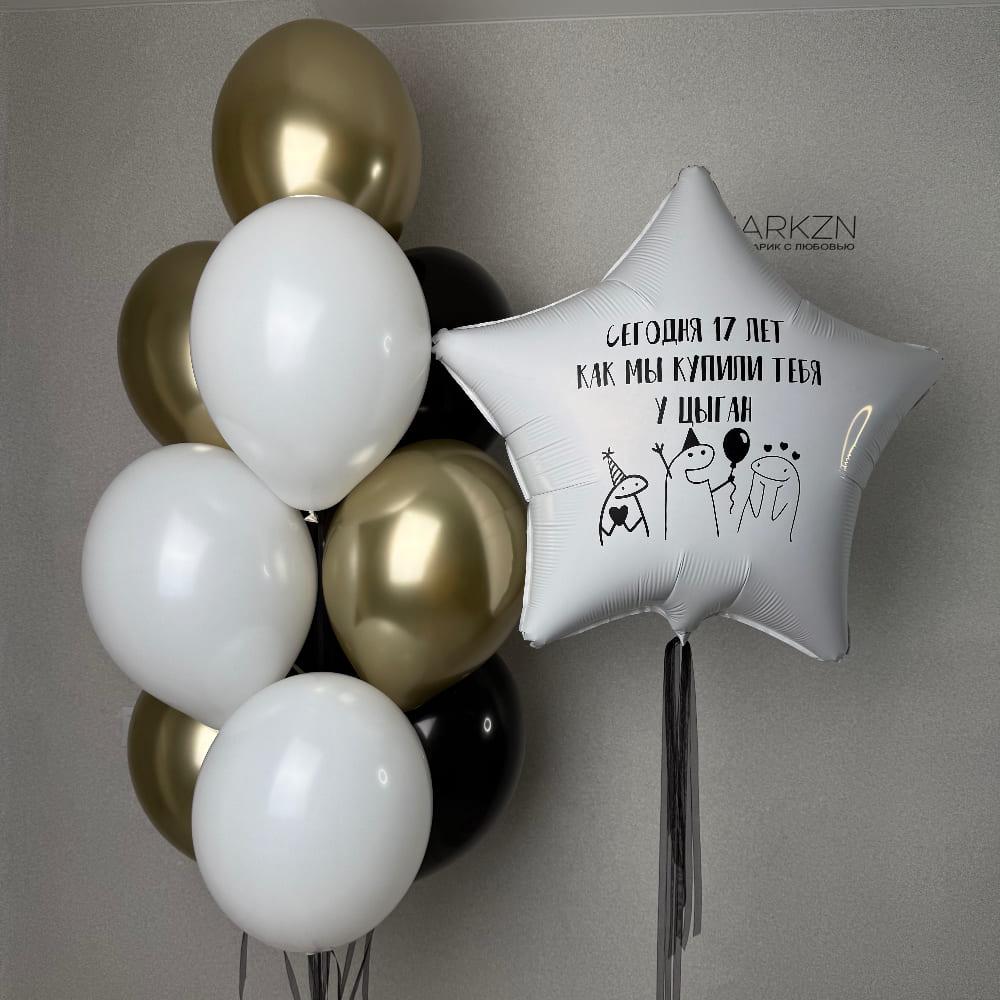 В центре композиции — большая фольгированная звезда с принтом. Мы наносим на неё ту самую легендарную фразу: "Сегодня 17 лет как мы купили тебя у Цыган". Это сразу задает тон всему празднику. Рядом мы собираем яркий и стильный букет из латексных шаров. Мы намеренно выбрали модную черно-бело-золотую гамму с эффектом хром и перламутром, чтобы композиция выглядела не дешево, а дорого и стильно. Ведь юмор должен быть качественным!