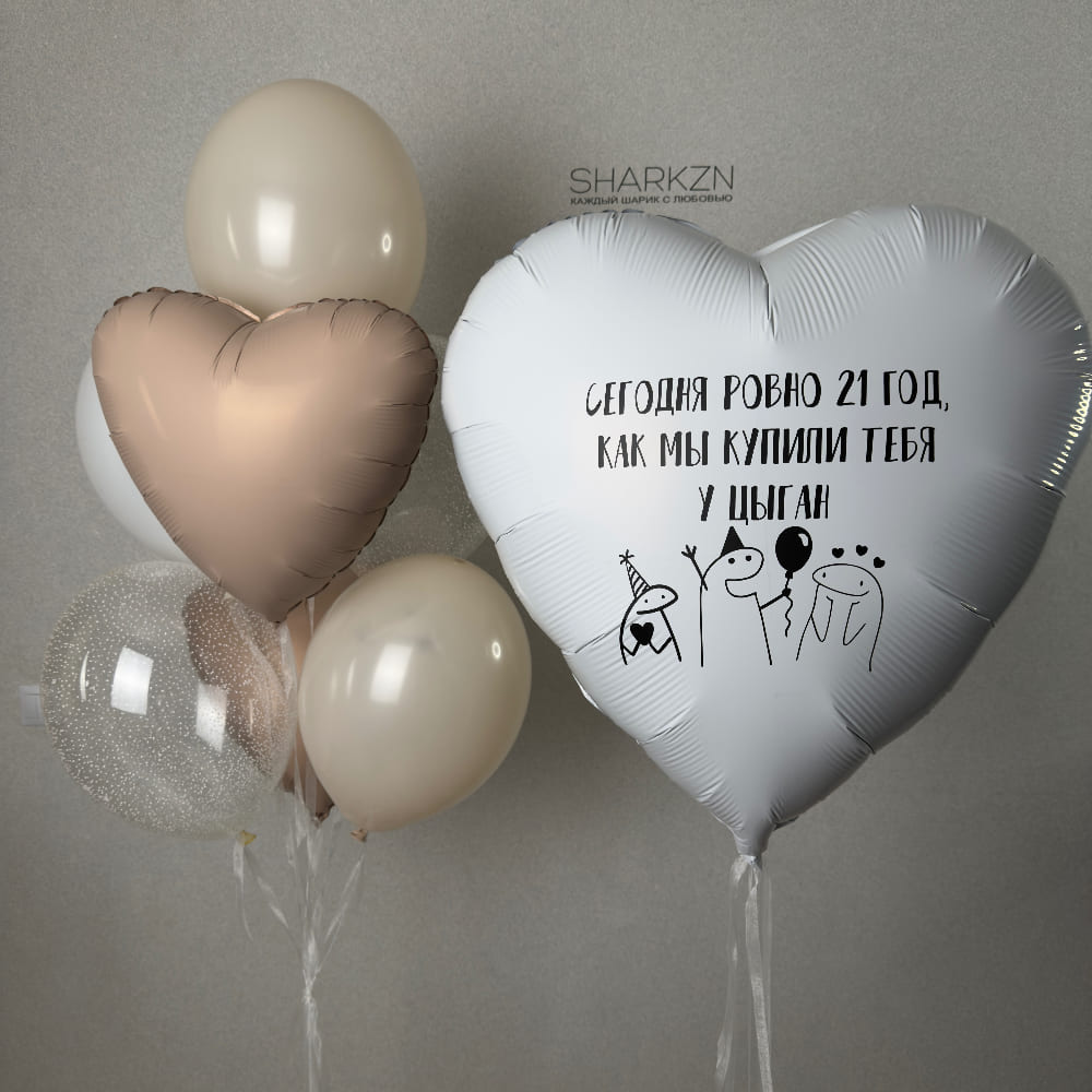 В центре композиции — большое фольгированное сердце, на которое мы нанесли ту самую забавную надпись. Представьте лицо именинника, когда он это увидит! Вокруг сердца мы собираем легкую и воздушную связку из шаров, среди которых есть и нежные сердца, и игривые шары с пенопластом, и классика. Мы намеренно выбрали светлую гамму, чтобы юмор оставался добрым и ироничным, а не пошлым.