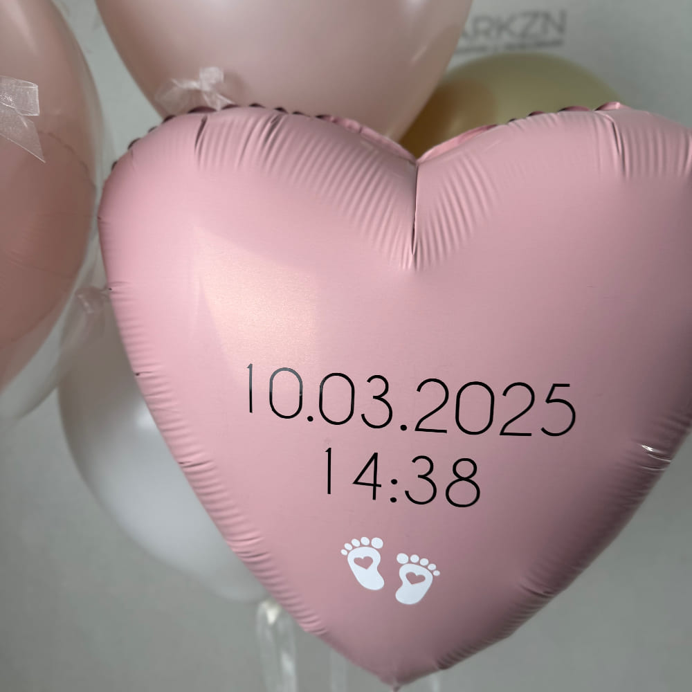 В центре этого изысканного набора — большой розовый стеклянный шар, который мы украшаем нежными белыми бантиками. На шар мы наносим всю самую важную информацию: имя, вес, рост, дату и время рождения вашей дочки. Рядом с ним — легкий фонтан из шаров, где розовое сердце с датой рождения, нежные розовые и белые шары и сияющий хром создают идеальное дополнение.