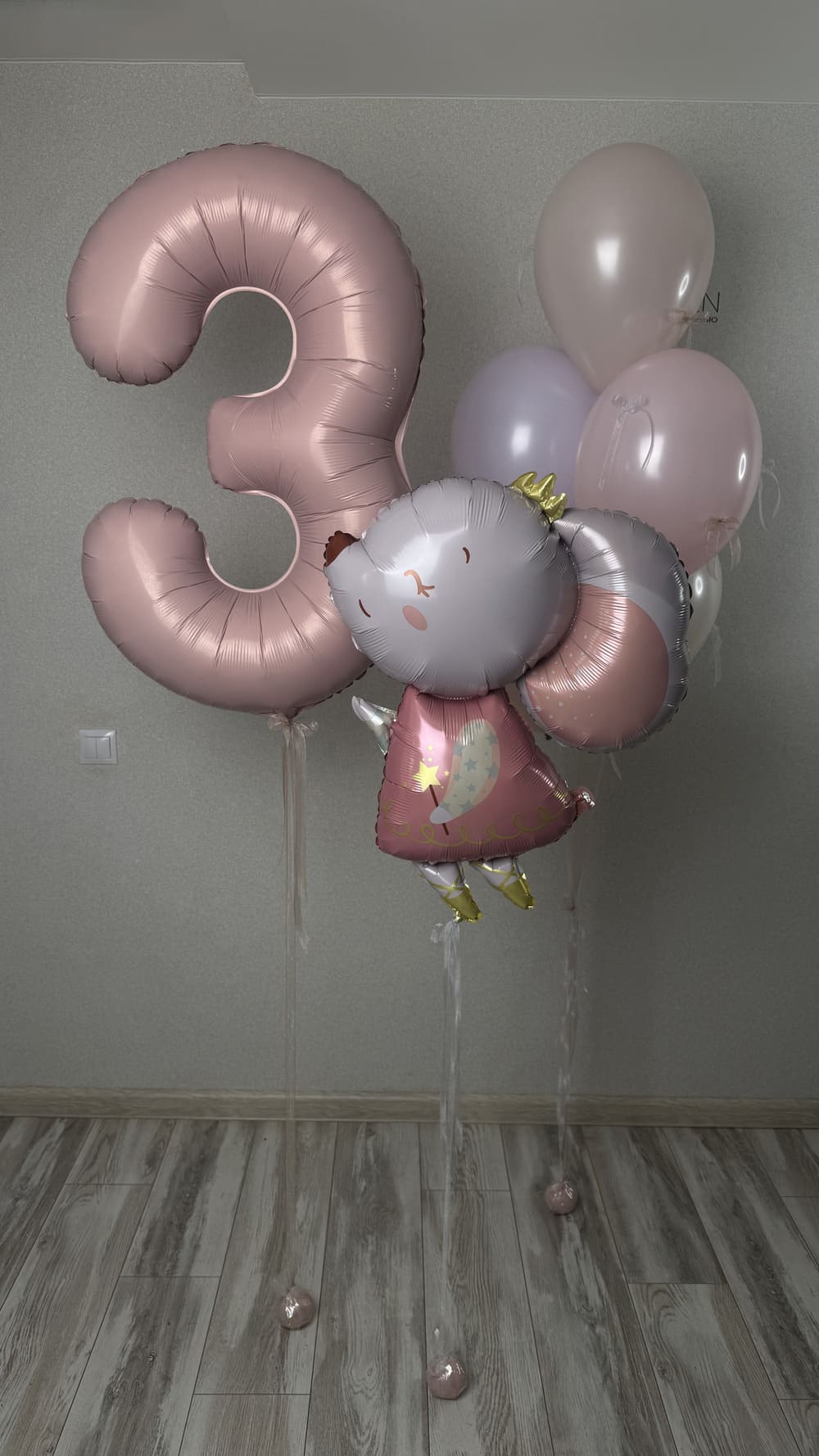 - Фонтан из 5 круглых шаров: 2 сиреневых, 3 розовых, грузик,