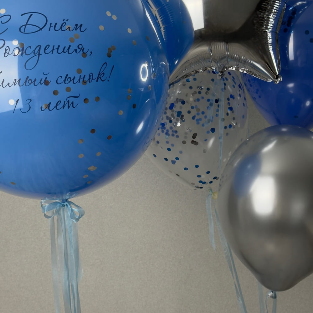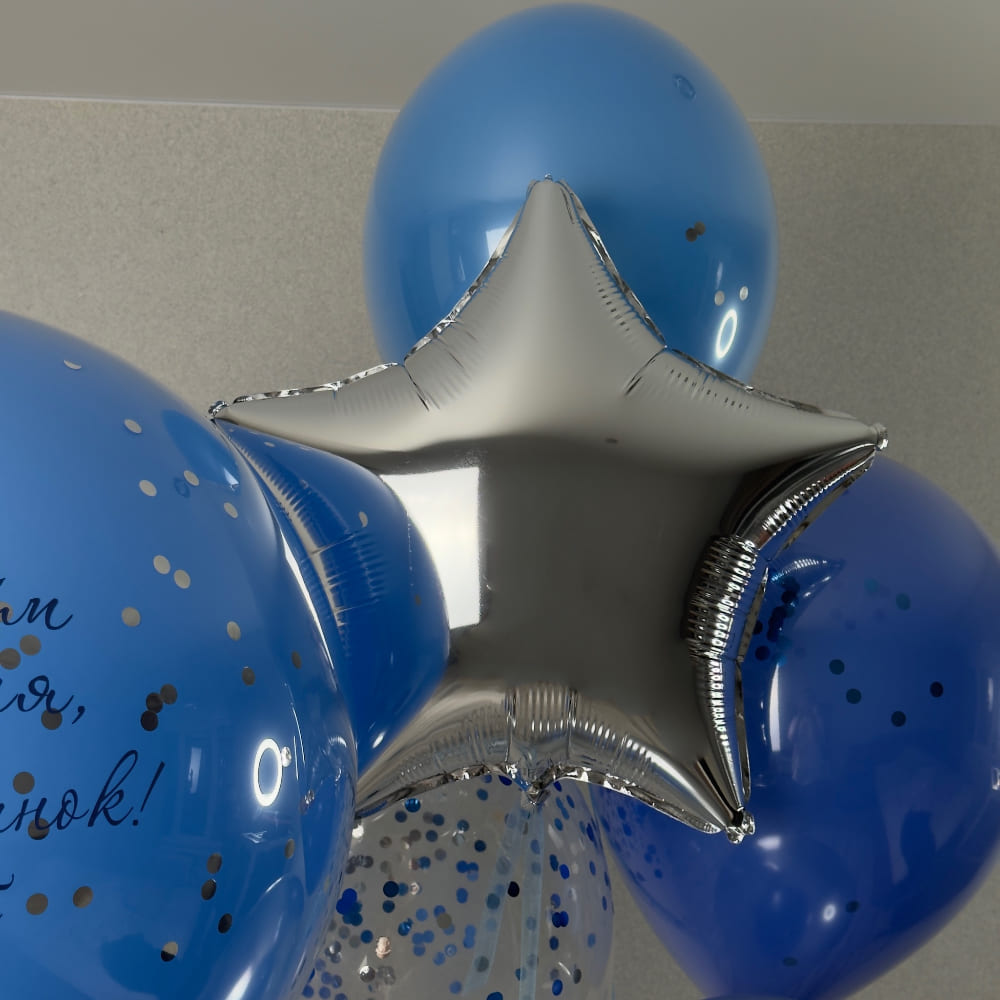 В центре композиции — большой синий стеклянный шар с элегантной черной надписью. Внутри шара мы создаем легкое наполнение, которое делает его похожим на драгоценный сосуд с посланием. Вокруг баблса мы собираем стильную связку в сине-серебряной гамме, где модные «стеклянные» шары с крошкой соседствуют с сияющим хромом и фольгированной звездой. Это выглядит современно, мужественно и очень продуманно.