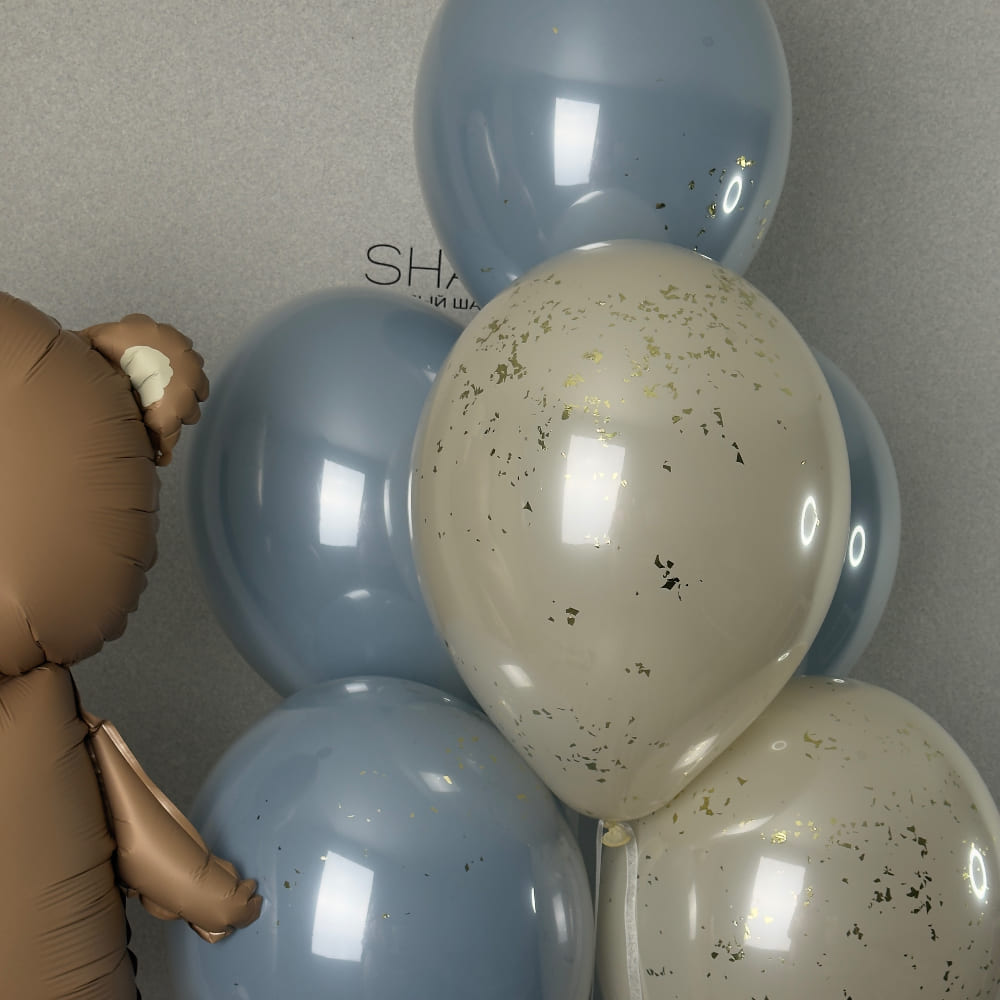В центре композиции — добрый Мишка с тортиком, который словно пришел поздравить именинника. Рядом с ним — большая объемная цифра 1, символ первого года жизни. А вокруг них мы создаем стильный фонтан из модных «стеклянных» шаров в благородной кремово-голубой гамме с золотыми акцентами. Это выглядит не по-детски стильно и очень продуманно.
