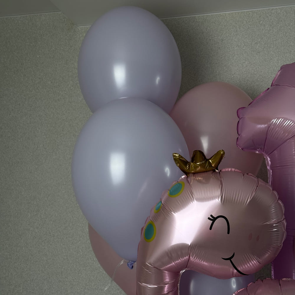- Фонтан из 5 круглых шаров: 3 сиреневых, 2 розовых, грузик