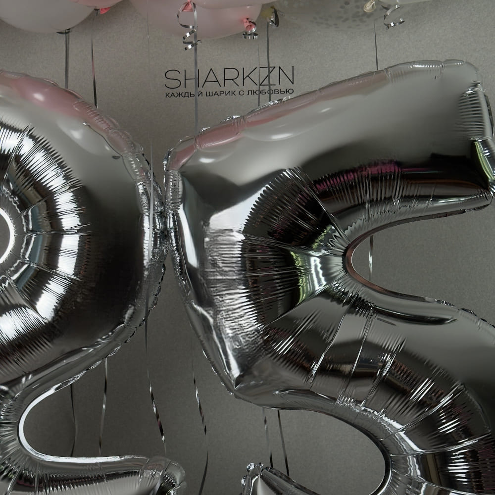 В центре внимания — объемные метровые цифры "2" и "5" с элегантной серебряной поверхностью. Они четко обозначают повод, делая праздник тематическим и сразу понятным для всех гостей. Вокруг них под потолком мы создаем облако из 10 шаров, в котором классические цвета дополнены модным металликом и игривым конфетти. Это создает объем и ощущение воздушного праздника, не загромождая пространство.