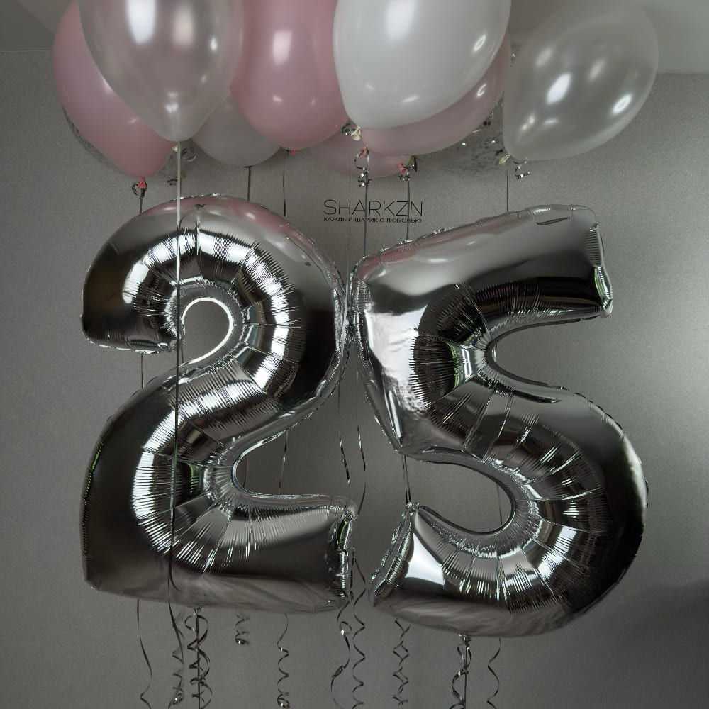 Классика юбилейного оформления, которая всегда работает безотказно. Шары, парящие под потолком, в сочетании с объемными цифрами 25 — это элегантное и проверенное решение для создания красивого и торжественного праздника. Идеально подходит и для мужчины, и для женщины.