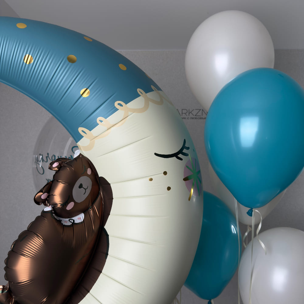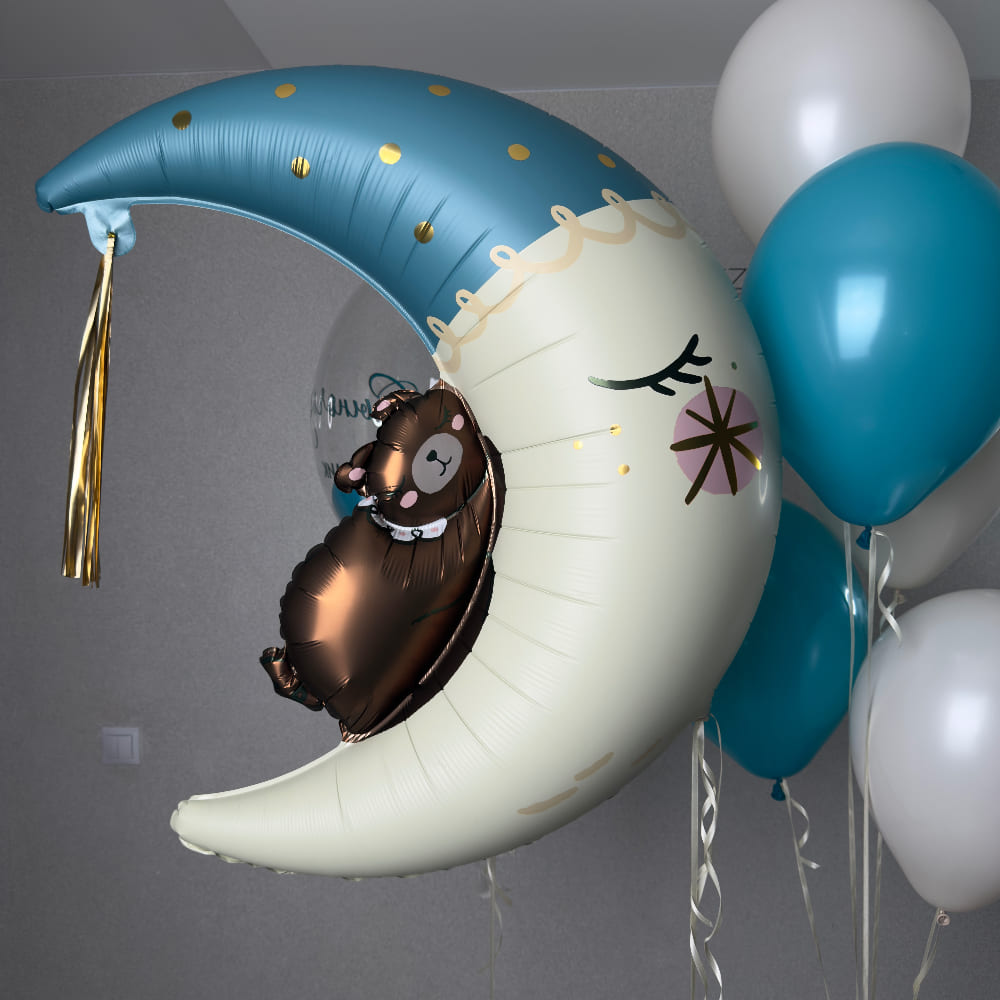 В центре композиции — большой прозрачный баблс, внутри которого мы создаем легкое наполнение, а на него наносим любую надпись: имя, дата рождения, трогательное послание. Рядом с ним парит загадочный фольгированный Полумесяц — символ мечты, света и начала нового пути. Вокруг них мы создаем легкую связку из ярких шаров, которые добавляют праздничного настроения.