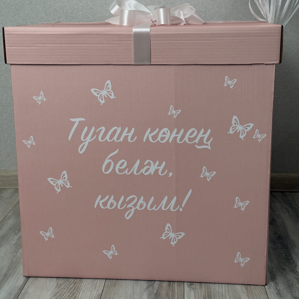 Поздравление на родном языке — это всегда особенно тепло и душевно. Коробка-сюрприз нежного оттенка «пыльная роза» с трогательной надписью на татарском языке «Туган конен белэн кызым!» станет самым искренним подарком для вашей дочки.