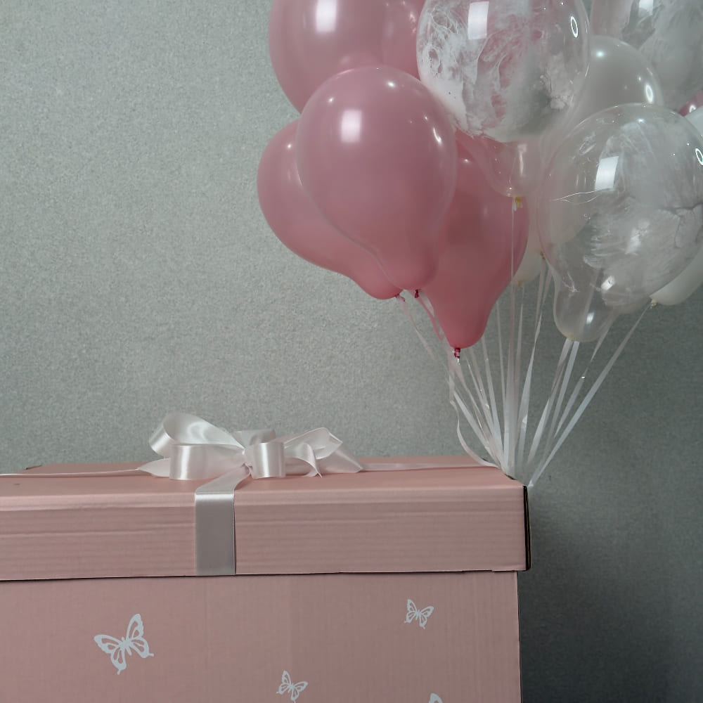 Внутри этой элегантной коробки именинницу ждет сюрприз — 25 маленьких шариков, среди которых 5 с красивым акриловым наполнением. Это добавляет композиции дополнительного волшебства и уникальности. Акриловые элементы красиво переливаются на свету, делая вылет шаров еще более зрелищным.